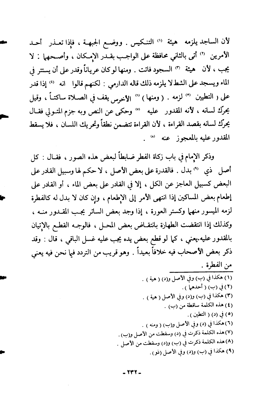 وَذَكَرَ الْإِمَامُ فِي بَابِ زَكَاةِ الْفِطْرِ ضَابِطًا لِبَعْضِ هَذِهِ الصُّوَرِ، فَقَالَ: كُلُّ أَصْلٍ ذِي بَدَلٍ فَالْقُدْرَةُ عَلَى بَعْضِ الْأَصْلِ، لَا حُكْمَ لَهَا وَسَبِيلُ الْقَادِرِ عَلَى الْبَعْضِ كَسَبِيلِ الْعَاجِزِ عَنْ الْكُلِّ، إلَّا فِي الْقَادِرِ عَلَى بَعْضِ الْمَاءِ، أَوْ الْقَادِرِ عَلَى إطْعَامِ بَعْضِ الْمَسَاكِينِ إذَا انْتَهَى الْأَمْرُ إلَى الْإِطْعَامِ، وَإِنْ كَانَ لَا بَدَلَ لَهُ كَالْفِطْرَةِ لَزِمَهُ الْمَيْسُورُ مِنْهُمَا وَكَسَتْرِ الْعَوْرَةِ، إذَا وَجَدَ بَعْضَ السَّاتِرِ يَجِبُ الْمَقْدُورُ مِنْهُ، وَكَذَلِكَ إذَا انْتَقَضَتْ الطَّهَارَةُ بِانْتِقَاضِ بَعْضِ الْمَحَلِّ، فَالْوَجْهُ الْقَطْعُ بِالْإِتْيَانِ بِالْمَقْدُورِ عَلَيْهِ يَعْنِي، كَمَا لَوْ قَطَعَ بَعْضَ يَدِهِ يَجِبُ عَلَيْهِ غَسْلُ الْبَاقِي، قَالَ: وَقَدْ ذَكَرَ بَعْضُ الْأَصْحَابِ فِيهِ خِلَافًا بَعِيدًا، وَهُوَ قَرِيبٌ مِنْ التَّرَدُّدِ فِيمَا نَحْنُ فِيهِ يَعْنِي مِنْ الْفِطْرَةِ.