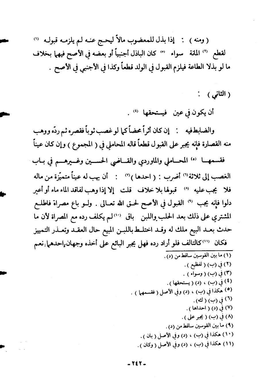 وَمِنْهُ) إذَا بَذَلَ لِلْمَعْضُوبِ مَالًا لِيَحُجَّ عَنْهُ لَمْ يَلْزَمْهُ قَبُولُهُ لِقَطْعِ الْمَانَّةِ سَوَاءٌ كَانَ الْبَاذِلُ أَجْنَبِيًّا أَوْ بَعْضَهُ فِي الْأَصَحِّ فِيهِمَا بِخِلَافِ مَا لَوْ بَذَلَا الطَّاعَةَ فَيَلْزَمُ الْقَبُولُ فِي الْوَلَدِ قَطْعًا، وَكَذَا فِي الْأَجْنَبِيِّ فِي الْأَصَحِّ (الثَّانِي) : أَنْ يَكُونَ فِي عَيْنٍ فَيَسْتَحِقُّهَا، وَالضَّابِطُ فِيهِ: إنْ كَانَ أَثَرًا مَحْضًا كَمَا لَوْ غَصَبَ ثَوْبًا فَقَصَّرَهُ ثُمَّ رَدَّهُ وَوَهَبَ مِنْهُ الْقِصَارَةَ فَإِنَّهُ يُجْبَرُ عَلَى الْقَبُولِ قَطْعًا قَالَهُ الْمَحَامِلِيُّ فِي (الْمَجْمُوعِ) وَإِنْ كَانَ عَيْنًا فَقَسَمَهَا الْمَحَامِلِيُّ وَالْمَاوَرْدِيُّ وَالْقَاضِي الْحُسَيْنُ وَغَيْرُهُمْ فِي بَابِ الْغَصْبِ إلَى ثَلَاثَةِ أَضْرُبٍ: (أَحَدُهَا) : أَنْ يَهَبَ لَهُ عَيْنًا مُتَمَيِّزَةً مِنْ مَالِهِ فَلَا يَجِبُ عَلَيْهِ قَبُولُهَا بِلَا خِلَافٍ قُلْت: إلَّا إذَا وَهَبَ لِفَاقِدِ الْمَاءِ مَاءً أَوْ أَعَارَ دَلْوًا فَإِنَّهُ يَجِبُ الْقَبُولُ فِي الْأَصَحِّ لِحَقِّ اللَّهِ تَعَالَى، وَلَوْ بَاعَ مُصَرَّاةً فَاطَّلَعَ الْمُشْتَرِي عَلَى ذَلِكَ بَعْدَ الْحَلْبِ، وَاللَّبَنُ بَاقٍ لَمْ يُكَلَّفْ رَدُّهُ مَعَ الْمُصَرَّاةِ؛ لِأَنَّ مَا حَدَثَ بَعْدَ الْبَيْعِ مِلْكٌ لَهُ وَقَدْ اخْتَلَطَ بِاللَّبَنِ الْمَبِيعِ حَالَ الْعَقْدِ وَتَعَذَّرَ التَّمْيِيزُ فَكَانَ كَالتَّالِفِ، فَلَوْ أَرَادَ رَدَّهُ يُجْبَرُ الْبَائِعُ عَلَى أَخْذِهِ وَجْهَانِ: أَحَدُهُمَا: نَعَمْ