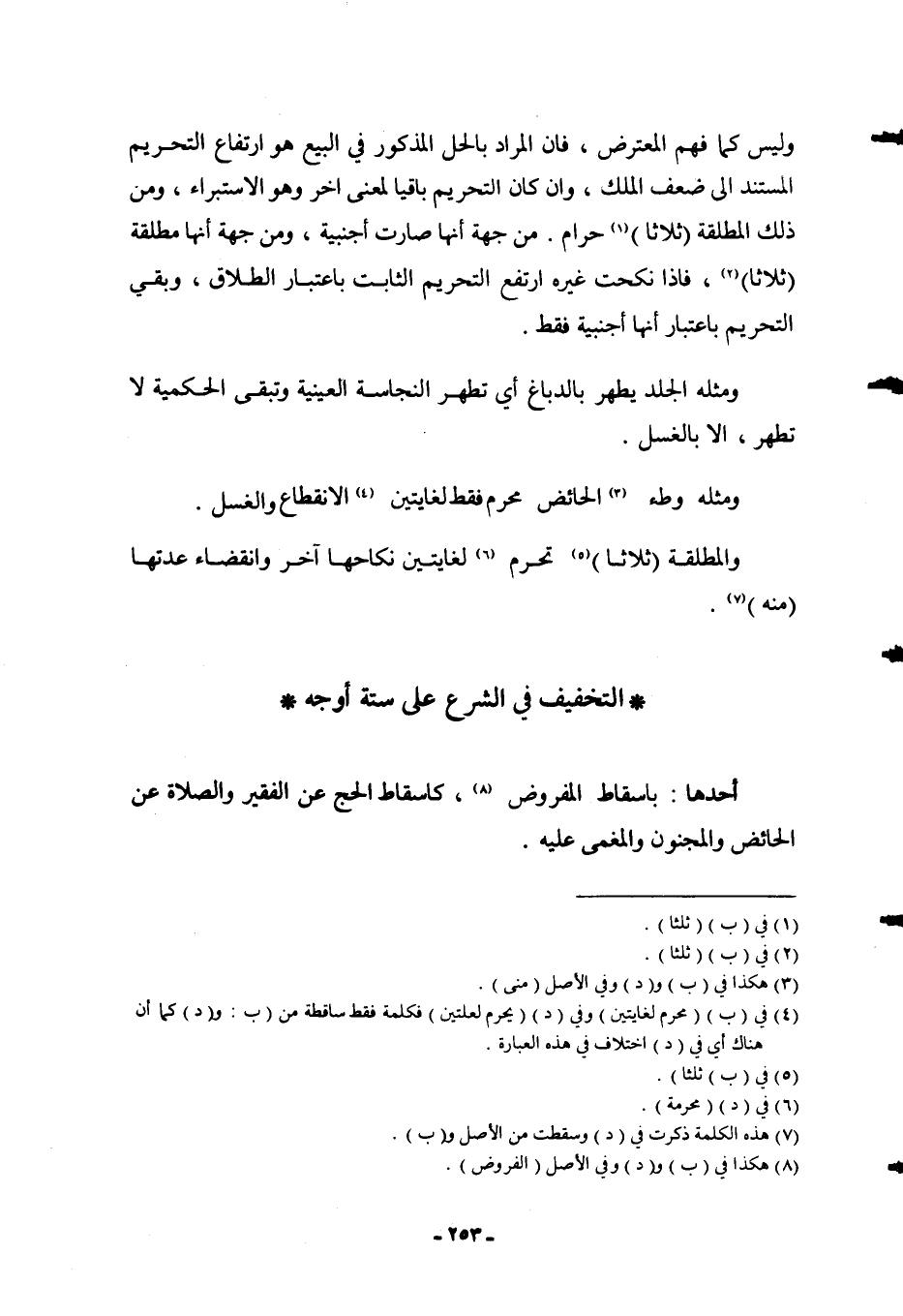 ٍ أَحَدُهَا: بِإِسْقَاطِ الْمَفْرُوضِ، كَإِسْقَاطِ الْحَجِّ عَنْ الْفَقِيرِ وَالصَّلَاةِ عَنْ الْحَائِضِ وَالْمَجْنُونِ وَالْمُغْمَى عَلَيْهِ.