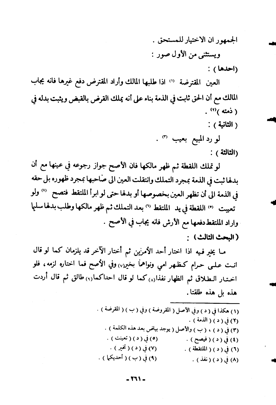 الْجُمْهُورُ أَنَّ الِاخْتِيَارَ لِلْمُسْتَحِقِّ وَيُسْتَثْنَى مِنْ الْأَوَّلِ صُوَرٌ: (أَحَدُهَا) : الْعَيْنُ الْمُقْتَرَضَةُ إذَا طَلَبَهَا الْمَالِكُ وَأَرَادَ الْمُقْتَرِضُ دَفْعَ غَيْرِهَا فَإِنَّهُ يُجَابُ الْمَالِكُ مَعَ أَنَّ الْحَقَّ ثَابِتٌ فِي الذِّمَّةِ بِنَاءً عَلَى أَنَّهُ يَمْلِكُ الْقَرْضَ بِالْقَبْضِ وَيَثْبُتُ بَدَلُهُ فِي (ذِمَّتِهِ) . (الثَّانِيَةُ) : لَوْ رَدَّ الْمَبِيعَ بِعَيْبٍ. (الثَّالِثَةُ) : لَوْ تَمَلَّكَ اللُّقَطَةَ ثُمَّ ظَهَرَ مَالِكُهَا، فَإِنَّ الْأَصَحَّ جَوَازُ رُجُوعِهِ فِي عَيْنِهَا مَعَ أَنَّ بَدَلَهَا ثَبَتَ فِي الذِّمَّةِ بِمُجَرَّدِ التَّمَلُّكِ وَانْتَقَلَتْ الْعَيْنُ إلَى صَاحِبِهَا بِمُجَرَّدِ ظُهُورِهِ بَلْ حَقُّهُ فِي الذِّمَّةِ إلَى أَنْ تَظْهَرَ الْعَيْنُ بِخُصُوصِهَا أَوْ بَدَلِهَا حَتَّى لَوْ أَبْرَأَ الْمُلْتَقِطَ فَتَصِحُّ وَلَوْ تَعَيَّبَتْ اللُّقَطَةُ فِي يَدِ الْمُلْتَقِطِ بَعْدَ التَّمَلُّكِ، ثُمَّ ظَهَرَ مَالِكُهَا وَطَلَبَ بَدَلَهَا سَلِيمًا، وَأَرَادَ الْمُلْتَقِطُ دَفْعَهَا مَعَ الْأَرْشِ فَإِنَّهُ يُجَابُ فِي الْأَصَحِّ.