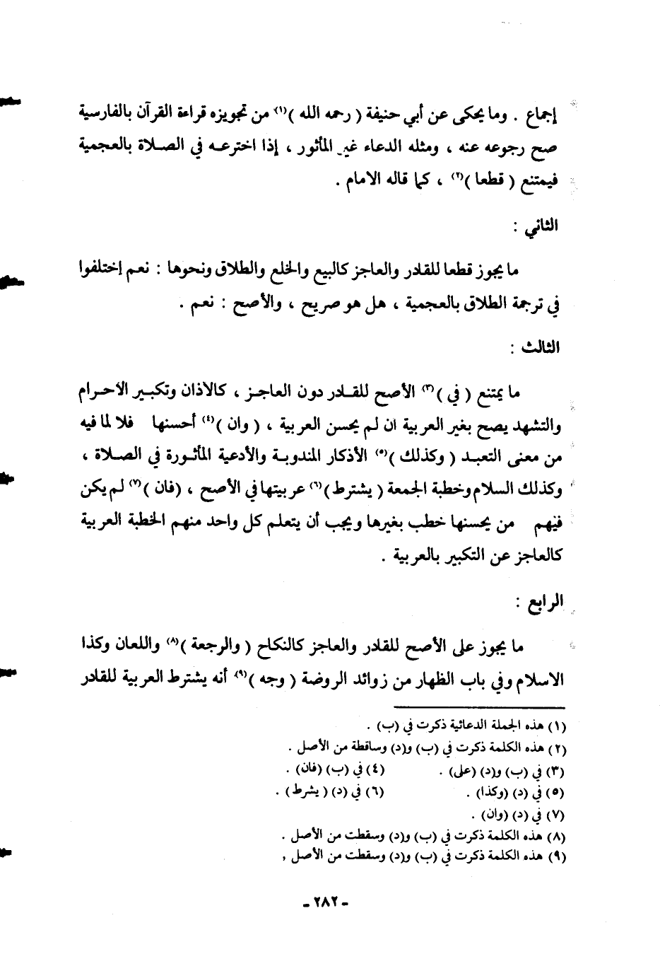 إجْمَاعٌ، وَمَا يُحْكَى عَنْ أَبِي حَنِيفَةَ (- رَحِمَهُ اللَّهُ -) مِنْ تَجْوِيزِهِ قِرَاءَةَ الْقُرْآنِ بِالْفَارِسِيَّةِ صَحَّ رُجُوعُهُ عَنْهُ، وَمِثْلُهُ الدُّعَاءُ غَيْرُ الْمَأْثُورِ، إذَا اخْتَرَعَهُ فِي الصَّلَاةِ بِالْعَجَمِيَّةِ فَيَمْتَنِعُ (قَطْعًا) ، كَمَا قَالَهُ الْإِمَامُ.
