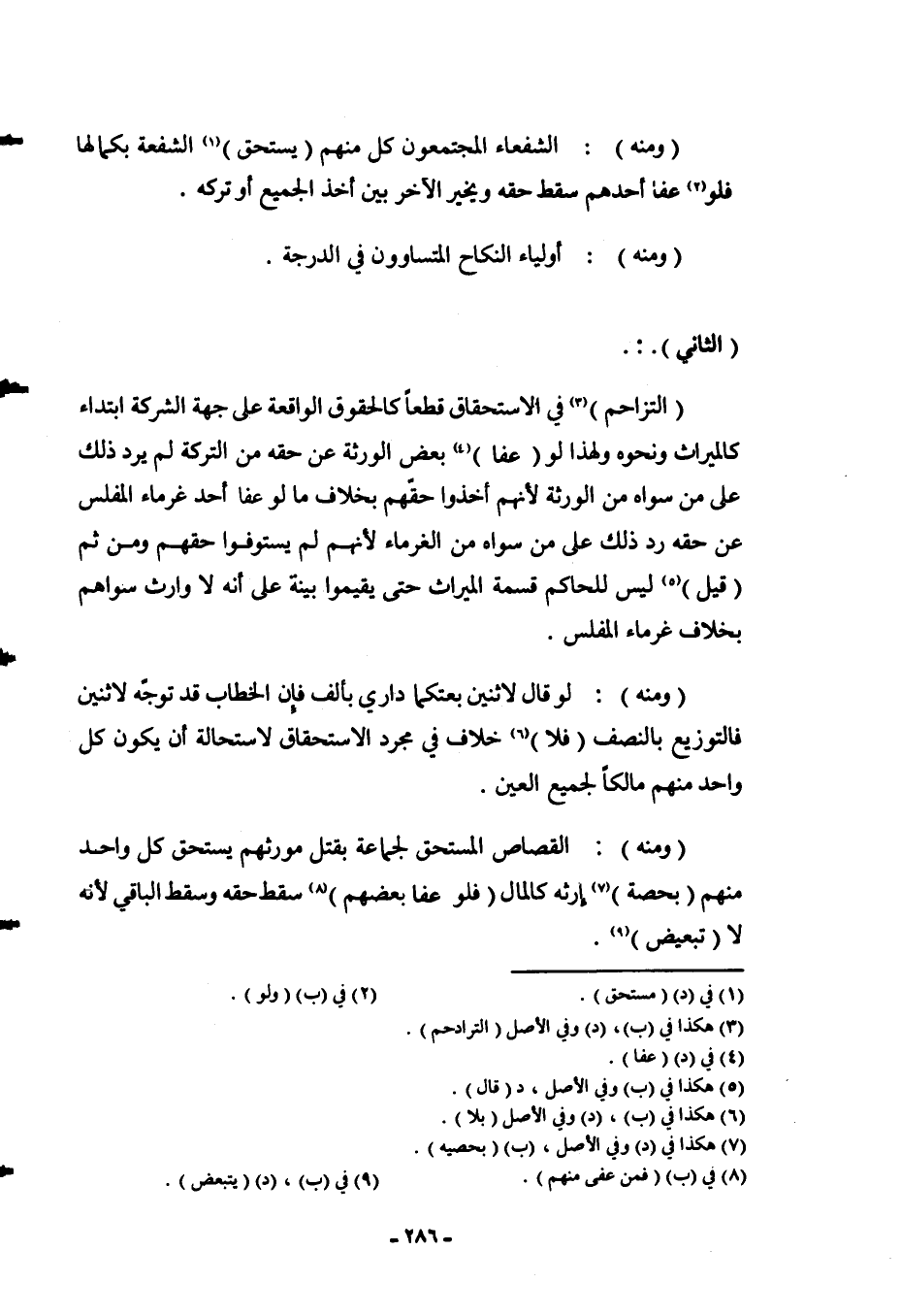 (الثَّانِي) : (التَّزَاحُمُ) فِي الِاسْتِحْقَاقِ قَطْعًا كَالْحُقُوقِ الْوَاقِعَةِ عَلَى جِهَةِ الشَّرِكَةِ ابْتِدَاءً كَالْمِيرَاثِ وَنَحْوِهِ؛ وَلِهَذَا لَوْ (عَفَا) بَعْضُ الْوَرَثَةِ عَنْ حَقِّهِ مِنْ التَّرِكَةِ لَمْ يُرَدَّ ذَلِكَ عَلَى مَنْ سِوَاهُ مِنْ الْوَرَثَةِ؛ لِأَنَّهُمْ أَخَذُوا حَقَّهُمْ بِخِلَافِ مَا لَوْ عَفَا أَحَدُ غُرَمَاءِ الْمُفْلِسِ عَنْ حَقِّهِ رُدَّ ذَلِكَ عَلَى مَنْ سِوَاهُ مِنْ الْغُرَمَاءِ؛ لِأَنَّهُمْ لَمْ يَسْتَوْفُوا حَقَّهُمْ وَمِنْ ثَمَّ (قِيلَ) : لَيْسَ لِلْحَاكِمِ قِسْمَةُ الْمِيرَاثِ حَتَّى يُقِيمُوا بَيِّنَةً عَلَى أَنَّهُ لَا وَارِثَ سِوَاهُمْ بِخِلَافِ غُرَمَاءِ الْمُفْلِسِ.