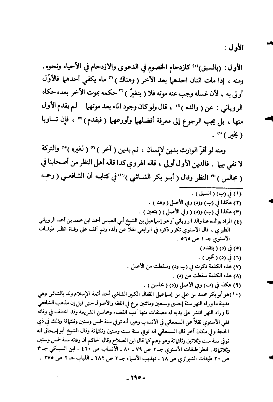 الْأَوَّلُ: الْأَوَّلُ: (بِالسَّبْقِ) كَازْدِحَامِ الْخُصُومِ فِي الدَّعْوَى وَالِازْدِحَامِ فِي، الْأَحْيَاءِ وَنَحْوِهِ، وَمِنْهُ، إذَا مَاتَ اثْنَانِ أَحَدُهُمَا بَعْدَ الْآخَرِ (وَهُنَاكَ) مَاءٌ يَكْفِي أَحَدَهُمَا، فَالْأَوَّلُ أَوْلَى بِهِ؛ لِأَنَّ غُسْلَهُ وَجَبَ عِنْدَ مَوْتِهِ فَلَا (يَتَغَيَّرُ) حُكْمُهُ بِمَوْتِ الْآخَرِ بَعْدَهُ حَكَاهُ الرُّويَانِيُّ: عَنْ (وَالِدِهِ) ، قَالَ: وَلَوْ كَانَ وُجُودُ الْمَاءِ بَعْدَ مَوْتِهِمَا لَمْ يُقَدَّمْ الْأَوَّلُ مِنْهَا، بَلْ يَجِبُ الرُّجُوعُ إلَى مَعْرِفَةِ أَفْضَلِهِمَا وَأَوْرَعِهِمَا (فَيُقَدَّمُ) ، فَإِنْ تَسَاوَيَا (يُخَيَّرُ) .