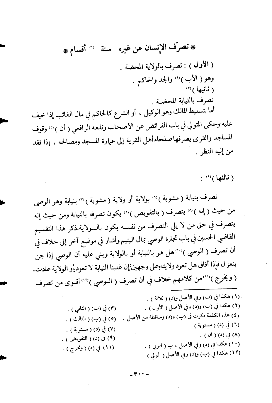 ٍ: (الْأَوَّلُ) : تَصَرُّفٌ بِالْوِلَايَةِ الْمَحْضَةِ، وَهُوَ (الْأَبُ) وَالْجَدُّ وَالْحَاكِمُ (ثَانِيهَا) تَصَرُّفٌ بِالنِّيَابَةِ الْمَحْضَةِ. إمَّا بِتَسْلِيطِ الْمَالِكِ وَهُوَ الْوَكِيلُ، أَوْ الشَّرْعُ كَالْحَاكِمِ فِي مَالِ الْغَائِبِ إذَا خِيفَ عَلَيْهِ وَحَكَى الْمُتَوَلِّي فِي بَابِ الْفَرَائِضِ عَنْ الْأَصْحَابِ وَتَابَعَهُ الرَّافِعِيُّ (أَنَّ) وُقُوفَ الْمَسَاجِدِ وَالْقُرَى يَصْرِفُهَا صُلَحَاءُ أَهْلِ الْقَرْيَةِ إلَى عِمَارَةِ الْمَسْجِدِ وَمَصَالِحِهِ، إذَا فُقِدَ مَنْ إلَيْهِ النَّظَرُ. (ثَالِثُهَا) : تُصْرَفُ بِنِيَابَةٍ (مَشُوبَةٍ) بِوِلَايَةٍ أَوْ وِلَايَةٍ (مَشُوبَةٍ) بِنِيَابَةٍ وَهُوَ الْوَصِيُّ مِنْ حَيْثُ (إنَّهُ) يَتَصَرَّفُ (بِالتَّفْوِيضِ) يَكُونُ تَصَرُّفُهُ بِالنِّيَابَةِ وَمِنْ حَيْثُ إنَّهُ يَتَصَرَّفُ فِي حَقِّ مَنْ لَا يَلِي التَّصَرُّفَ مِنْ نَفْسِهِ يَكُونُ بِالْوِلَايَةِ، ذَكَرَ هَذَا التَّقْسِيمَ الْقَاضِي الْحُسَيْنُ فِي بَابِ تِجَارَةِ الْوَصِيِّ بِمَالِ الْيَتِيمِ وَأَشَارَ فِي مَوْضِعٍ آخَرَ إلَى خِلَافٍ فِي أَنَّ تَصَرُّفَ (الْوَصِيِّ) هَلْ هُوَ بِالنِّيَابَةِ أَوْ بِالْوِلَايَةِ وَبُنِيَ عَلَيْهِ أَنَّ الْوَصِيَّ إذَا جُنَّ يَنْعَزِلُ فَإِذَا أَفَاقَ هَلْ تَعُودُ وِلَايَتُهُ: عَلَى وَجْهَيْنِ: إنْ غَلَّبْنَا النِّيَابَةَ لَا تَعُودُ، أَوْ الْوِلَايَةَ عَادَتْ، (وَيَخْرُجُ) مِنْ كَلَامِهِمْ خِلَافٌ فِي أَنَّ تَصَرُّفَ (الْوَصِيِّ) أَقْوَى مِنْ تَصَرُّفِ