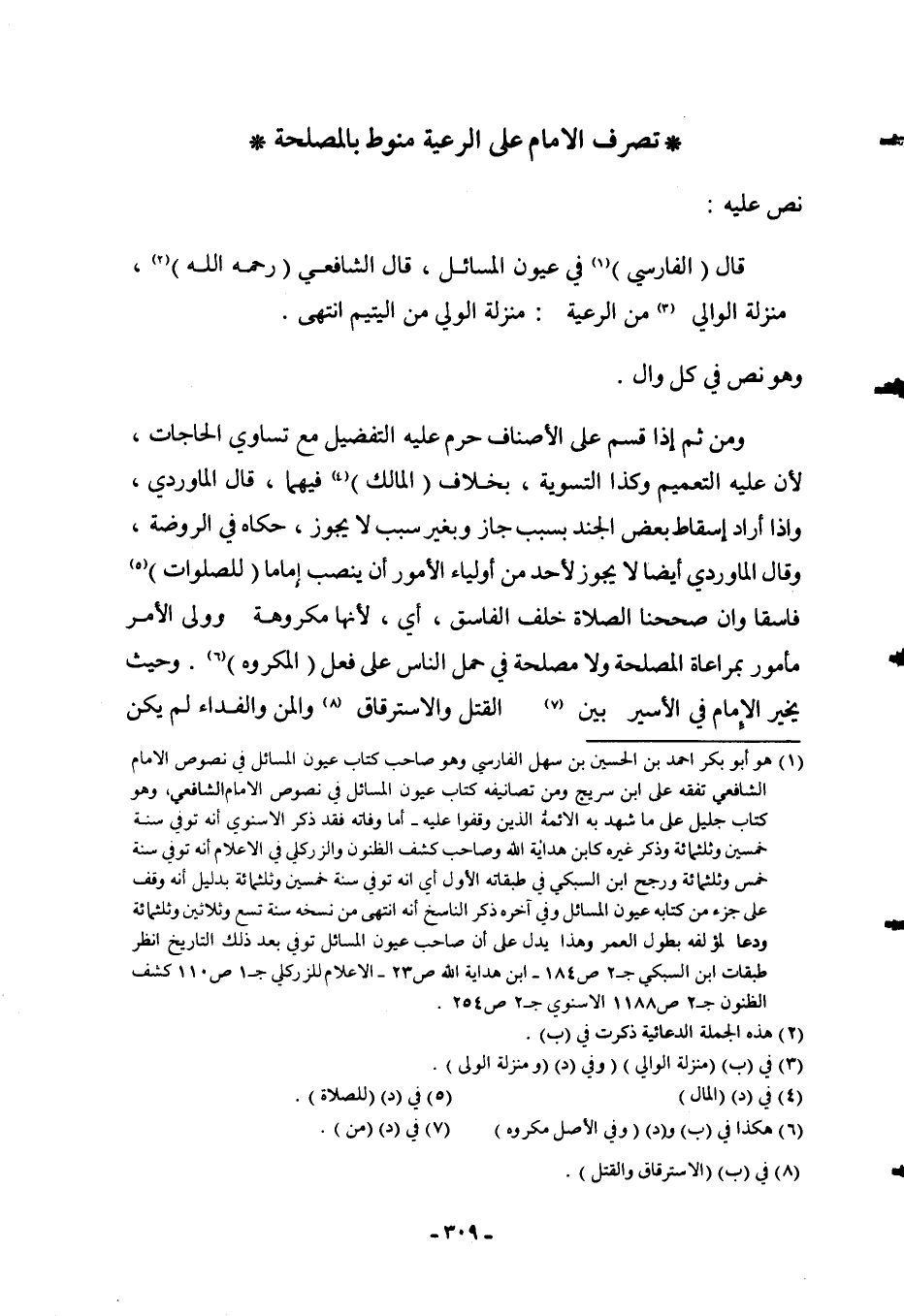 ِ نَصَّ عَلَيْهِ: قَالَ (الْفَارِسِيُّ) فِي عُيُونِ الْمَسَائِلِ: قَالَ الشَّافِعِيُّ (- رَحِمَهُ اللَّهُ -) : مَنْزِلَةُ الْوَالِي مِنْ الرَّعِيَّةِ: مَنْزِلَةُ الْوَلِيُّ مِنْ الْيَتِيمِ انْتَهَى. وَهُوَ نَصٌّ فِي كُلِّ وَالٍ، وَمِنْ ثَمَّ إذَا قَسَّمَ عَلَى الْأَصْنَافِ حَرُمَ عَلَيْهِ التَّفْضِيلُ مَعَ تَسَاوِي الْحَاجَاتِ؛ لِأَنَّ عَلَيْهِ التَّعْمِيمَ وَكَذَا التَّسْوِيَةُ، بِخِلَافِ (الْمَالِكِ) فِيهِمَا، قَالَ الْمَاوَرْدِيُّ، وَإِذَا أَرَادَ إسْقَاطَ بَعْضِ الْجَنَدِ بِسَبَبٍ جَازَ وَبِغَيْرِ سَبَبٍ لَا يَجُوزُ، حَكَاهُ فِي الرَّوْضَةِ، وَقَالَ الْمَاوَرْدِيُّ أَيْضًا لَا يَجُوزُ لِأَحَدٍ مِنْ أَوْلِيَاءِ الْأُمُورِ أَنْ يُنَصِّبَ إمَامًا (لِلصَّلَوَاتِ) فَاسِقًا وَإِنْ صَحَّحْنَا الصَّلَاةَ خَلْفَ الْفَاسِقِ، أَيْ؛ لِأَنَّهَا مَكْرُوهَةٌ وَوَلِيُّ الْأَمْرِ مَأْمُورٌ بِمُرَاعَاةِ الْمَصْلَحَةِ وَلَا مَصْلَحَةَ فِي حَمْلِ النَّاسِ عَلَى فِعْلِ (الْمَكْرُوهِ) ، وَحَيْثُ يُخَيَّرُ الْإِمَامُ فِي الْأَسِيرِ بَيْنَ الْقَتْلِ وَالِاسْتِرْقَاقِ وَالْمَنِّ وَالْفِدَاءِ لَمْ يَكُنْ