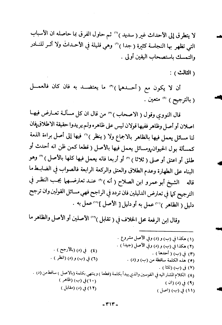 لَا يَتَطَرَّقُ إلَى الْأَحْدَاثِ غَيْرُ (سَدِيدٍ) ثُمَّ حَاوَلَ الْفَرْقَ بِمَا حَاصِلُهُ أَنَّ الْأَسْبَابَ الَّتِي تَظْهَرُ بِهَا النَّجَاسَةُ كَثِيرَةٌ (جِدًّا) ، وَهِيَ قَلِيلَةٌ فِي الْأَحْدَاثِ وَلَا أَثَرَ لِلنَّادِرِ، وَالتَّمَسُّكُ بِاسْتِصْحَابِ الْيَقِينِ أَوْلَى. (الثَّالِثُ) : أَنْ لَا يَكُونَ مَعَ (أَحَدِهِمَا) مَا يَعْتَضِدُ بِهِ، فَإِنْ كَانَ فَالْعَمَلُ (بِالتَّرْجِيحِ) مُتَعَيِّنٌ، قَالَ النَّوَوِيُّ: وَقَوْلُ (الْأَصْحَابِ) مَنْ قَالَ: إنَّ كُلَّ مَسْأَلَةٍ تَعَارَضَ فِيهَا أَصْلَانِ أَوْ أَصْلٌ وَظَاهِرٌ، فَفِيهَا قَوْلَانِ لَيْسَ عَلَى ظَاهِرِهِ وَلَمْ يُرِيدُوا حَقِيقَةَ الْإِطْلَاقِ، فَإِنَّ لَنَا مَسَائِلَ يُعْمَلُ فِيهَا بِالظَّاهِرِ بِالْإِجْمَاعِ وَلَا (يُنْظَرُ) فِيهَا إلَى أَصْلِ بَرَاءَةِ الذِّمَّةِ كَمَسْأَلَةِ بَوْلِ الْحَيَوَانِ، وَمَسَائِلَ يُعْمَلُ فِيهَا بِالْأَصْلِ (قَطْعًا) كَمَنْ ظَنَّ أَنَّهُ أَحْدَثَ، أَوْ طَلَّقَ أَوْ أَعْتَقَ أَوْ صَلَّى (ثَلَاثًا) أَوْ أَرْبَعًا، فَإِنَّهُ يُعْمَلُ فِيهَا كُلِّهَا (بِالْأَصْلِ) وَهُوَ الْبِنَاءُ عَلَى الطَّهَارَةِ، وَعَدَمُ الطَّلَاقِ وَالْعِتْقُ وَالرَّكْعَةُ الرَّابِعَةُ، فَالصَّوَابُ فِي الضَّابِطِ مَا قَالَهُ الشَّيْخُ أَبُو عَمْرِو بْنُ الصَّلَاحِ: (إنَّهُ) عِنْدَ تَعَارُضِهِمَا يَجِبُ النَّظَرُ فِي التَّرْجِيحِ كَمَا فِي تَعَارُضِ الدَّلِيلَيْنِ، فَإِنْ تَرَدَّدَ فِي الرَّاجِحِ فَهِيَ مَسَائِلُ الْقَوْلَيْنِ وَإِنْ تَرَجَّحَ دَلِيلُ (الظَّاهِرِ) عُمِلَ بِهِ أَوْ دَلِيلُ [الْأَصْلِ] عُمِلَ بِهِ.