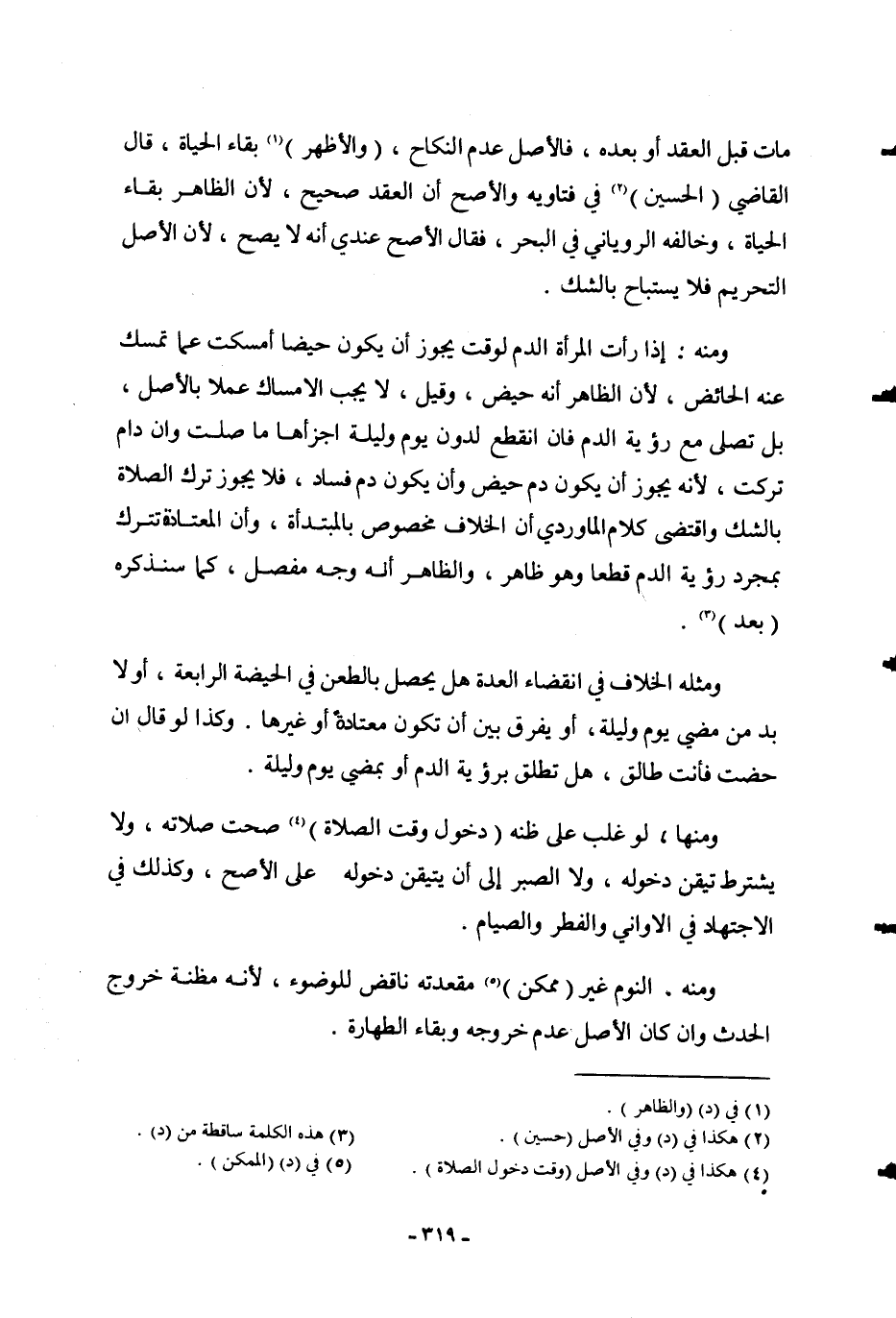 وَمِنْهُ: إذَا رَأَتْ الْمَرْأَةُ الدَّمَ لِوَقْتٍ يَجُوزُ أَنْ يَكُونَ حَيْضًا أَمْسَكَتْ عَمَّا تُمْسِكُ عَنْهُ الْحَائِضُ؛ لِأَنَّ الظَّاهِرَ أَنَّهُ حَيْضٌ، وَقِيلَ: لَا يَجِبُ الْإِمْسَاكُ عَمَلًا بِالْأَصْلِ، بَلْ تُصَلِّي مَعَ رُؤْيَةِ الدَّمِ فَإِنْ انْقَطَعَ لِدُونِ يَوْمٍ وَلَيْلَةٍ أَجْزَأَهَا مَا صَلَّتْ وَإِنْ دَامَ تَرَكَتْ؛ لِأَنَّهُ يَجُوزُ أَنْ يَكُونَ دَمَ حَيْضٍ، وَأَنْ يَكُونَ دَمَ فَسَادٍ، فَلَا يَجُوزُ تَرْكُ الصَّلَاةِ بِالشَّكِّ، وَاقْتَضَى كَلَامُ الْمَاوَرْدِيِّ أَنَّ الْخِلَافَ مَخْصُوصٌ بِالْمُبْتَدَأَةِ، وَأَنَّ الْمُعْتَادَةَ تَتْرُكُ بِمُجَرَّدِ رُؤْيَةِ الدَّمِ قَطْعًا وَهُوَ ظَاهِرٌ، وَالظَّاهِرُ أَنَّهُ وَجْهٌ مُفَصَّلٌ، كَمَا سَنَذْكُرُهُ (بَعْدُ) ، وَمِثْلُهُ الْخِلَافُ فِي انْقِضَاءِ الْعِدَّةِ هَلْ يَحْصُلُ بِالطَّعْنِ فِي الْحَيْضَةِ الرَّابِعَةِ، أَوْ لَا بُدَّ مِنْ مُضِيِّ يَوْمٍ وَلَيْلَةٍ، أَوْ يُفَرَّقُ بَيْنَ أَنْ تَكُونَ مُعْتَادَةً أَوْ غَيْرَهَا، وَكَذَا لَوْ قَالَ: إنْ حِضْت فَأَنْتِ طَالِقٌ، هَلْ تَطْلُقُ بِرُؤْيَةِ الدَّمِ أَوْ بِمُضِيِّ يَوْمٍ وَلَيْلَةٍ.