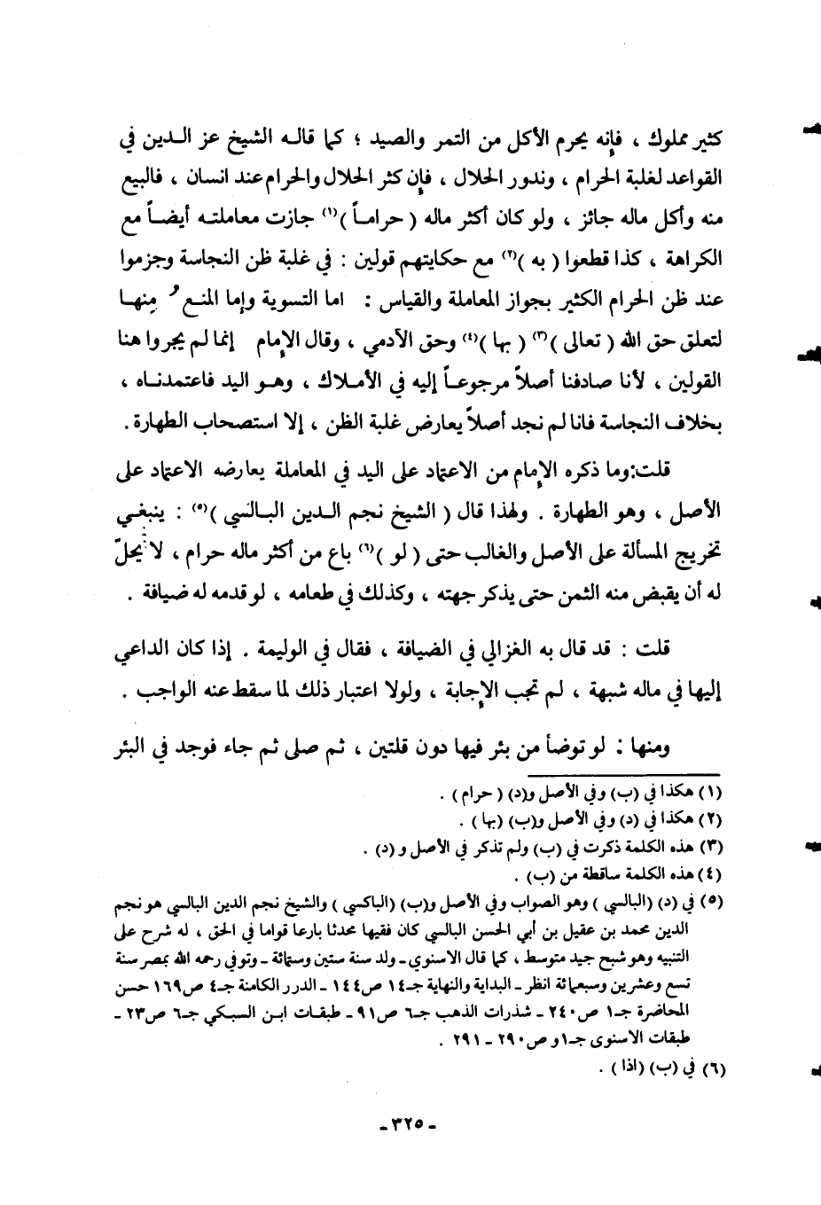 كَثِيرٍ مَمْلُوكٍ، فَإِنَّهُ يُحَرَّمُ الْأَكْلُ مِنْ التَّمْرِ وَالصَّيْدِ؛ كَمَا قَالَهُ الشَّيْخُ عِزُّ الدِّينِ فِي الْقَوَاعِدِ لِغَلَبَةِ الْحَرَامِ، وَنُدُورِ الْحَلَالِ، فَإِنْ كَثُرَ الْحَلَالُ وَالْحَرَامُ عِنْدَ إنْسَانٍ، فَالْبَيْعُ مِنْهُ وَأَكْلُ مَالِهِ جَائِزٌ، وَلَوْ كَانَ أَكْثَرُ مَالِهِ (حَرَامًا) جَازَتْ مُعَامَلَتُهُ أَيْضًا مَعَ الْكَرَاهَةِ، كَذَا قَطَعُوا (بِهِ) مَعَ حِكَايَتِهِمْ قَوْلَيْنِ: فِي غَلَبَةِ ظَنِّ النَّجَاسَةِ وَجَزَمُوا عِنْدَ ظَنِّ الْحَرَامِ الْكَثِيرِ بِجَوَازِ الْمُعَامَلَةِ، وَالْقِيَاسُ: إمَّا التَّسْوِيَةُ وَإِمَّا الْمَنْعُ مِنْهَا لِتَعَلُّقِ حَقِّ اللَّهِ (تَعَالَى) (بِهَا) وَحَقِّ الْآدَمِيِّ، وَقَالَ الْإِمَامُ: إنَّمَا لَمْ يُجْرُوا هُنَا الْقَوْلَيْنِ؛ لِأَنَّا صَادَفْنَا أَصْلًا مَرْجُوعًا إلَيْهِ فِي الْأَمْلَاكِ، وَهُوَ الْيَدُ فَاعْتَمَدْنَاهُ، بِخِلَافِ النَّجَاسَةِ، فَإِنَّا لَمْ نَجِدْ أَصْلًا يُعَارِضُ غَلَبَةَ الظَّنِّ، إلَّا اسْتِصْحَابَ الطَّهَارَةِ. قُلْت: وَمَا ذَكَرَهُ الْإِمَامُ مِنْ الِاعْتِمَادِ عَلَى الْيَدِ فِي الْمُعَامَلَةِ يُعَارِضُهُ الِاعْتِمَادُ عَلَى الْأَصْلِ، وَهُوَ الطَّهَارَةُ؛ وَلِهَذَا قَالَ (الشَّيْخُ نَجْمُ الدِّينِ الْبَالِسِيُّ) : يَنْبَغِي تَخْرِيجُ الْمَسْأَلَةِ عَلَى الْأَصْلِ وَالْغَالِبِ حَتَّى (لَوْ) بَاعَ مَنْ أَكْثَرُ مَالِهِ حَرَامٌ، لَا يَحِلُّ لَهُ أَنْ يَقْبِضَ مِنْهُ الثَّمَنَ حَتَّى يَذْكُرَ جِهَتَهُ، وَكَذَلِكَ فِي طَعَامِهِ، لَوْ قَدَّمَهُ لَهُ ضِيَافَةً. قُلْت: قَدْ قَالَ بِهِ الْغَزَالِيُّ فِي الضِّيَافَةِ، فَقَالَ فِي الْوَلِيمَةِ: إذَا كَانَ الدَّاعِي إلَيْهَا فِي مَالِهِ شُبْهَةٌ، لَمْ تَجِبْ الْإِجَابَةُ، وَلَوْلَا اعْتِبَارُ ذَلِكَ لَمَا سَقَطَ عَنْهُ الْوَاجِبُ.