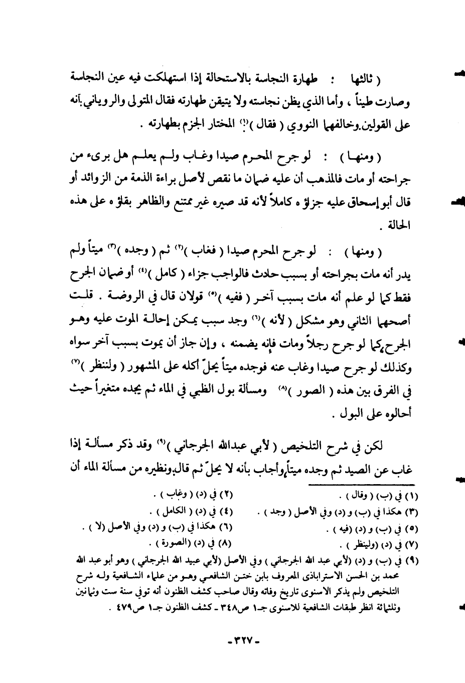 (وَمِنْهَا) : لَوْ جَرَحَ الْمُحْرِمُ صَيْدًا (فَغَابَ) ثُمَّ (وَجَدَهُ) مَيِّتًا وَلَمْ يَدْرِ أَنَّهُ مَاتَ بِجِرَاحَتِهِ أَوْ بِسَبَبٍ حَادِثٍ، فَالْوَاجِبُ جَزَاءٌ (كَامِلٌ) أَوْ ضَمَانُ الْجُرْحِ فَقَطْ كَمَا لَوْ عَلِمَ أَنَّهُ مَاتَ بِسَبَبٍ آخَرَ (فَفِيهِ) قَوْلَانِ قَالَ فِي الرَّوْضَةِ: قُلْت: أَصَحُّهُمَا الثَّانِي وَهُوَ مُشْكِلٌ؛ (لِأَنَّهُ) وُجِدَ سَبَبٌ يُمْكِنُ إحَالَةُ الْمَوْتِ عَلَيْهِ وَهُوَ الْجُرْحُ كَمَا لَوْ جَرَحَ رَجُلًا وَمَاتَ فَإِنَّهُ يَضْمَنُهُ، وَإِنْ جَازَ أَنْ يَمُوتَ بِسَبَبٍ آخَرَ سِوَاهُ، وَكَذَلِكَ لَوْ جَرَحَ صَيْدًا وَغَابَ عَنْهُ فَوَجَدَهُ مَيِّتًا يَحِلُّ أَكْلُهُ عَلَى الْمَشْهُورِ (وَلْنَنْظُرْ) فِي الْفَرْقِ بَيْنَ هَذِهِ (الصُّوَرِ) وَمَسْأَلَةِ بَوْلِ الظَّبْيِ فِي الْمَاءِ ثُمَّ يَجِدُهُ مُتَغَيِّرًا حَيْثُ أَحَالُوهُ عَلَى الْبَوْلِ، لَكِنْ فِي شَرْحِ التَّلْخِيصِ (لِأَبِي عَبْدِ اللَّهِ الْجُرْجَانِيِّ) وَقَدْ ذَكَرَ مَسْأَلَةَ إذَا غَابَ عَنْ الصَّيْدِ ثُمَّ وَجَدَهُ مَيِّتًا، وَأَجَابَ بِأَنَّهُ لَا يَحِلُّ ثُمَّ قَالَ: وَنَظِيرُهُ مِنْ مَسْأَلَةِ الْمَاءِ أَنْ