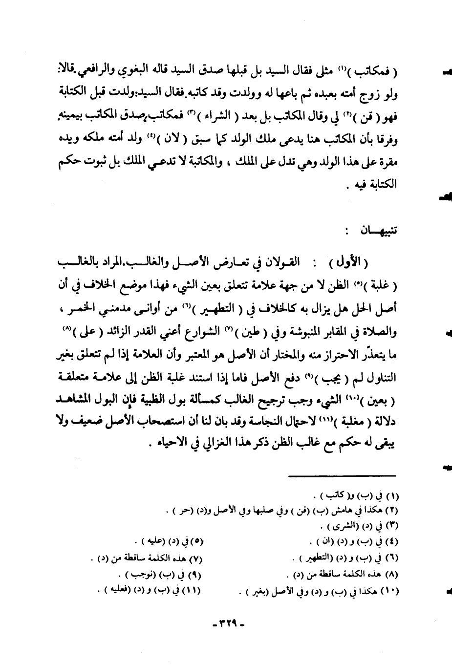 تَنْبِيهَانِ (الْأَوَّلُ) : الْقَوْلَانِ فِي تَعَارُضِ الْأَصْلِ وَالْغَالِبِ. الْمُرَادُ بِالْغَالِبِ (غَلَبَةُ) الظَّنِّ لَا مِنْ جِهَةِ عَلَامَةٍ تَتَعَلَّقُ بِعَيْنِ الشَّيْءِ، فَهَذَا مَوْضِعُ الْخِلَافِ فِي أَنَّ أَصْلَ الْحِلِّ هَلْ يُزَالُ بِهِ كَالْخِلَافِ فِي (التَّطْهِيرِ) مِنْ أَوَانِي مُدْمِنِي الْخَمْرِ، وَالصَّلَاةِ فِي الْمَقَابِرِ الْمَنْبُوشَةِ وَفِي (طِينِ) الشَّوَارِعِ؟ أَعْنِي الْقَدْرَ الزَّائِدَ (عَلَى) مَا يَتَعَذَّرُ الِاحْتِرَازُ مِنْهُ وَالْمُخْتَارُ أَنَّ الْأَصْلَ هُوَ الْمُعْتَبَرُ، وَأَنَّ الْعَلَامَةَ إذَا لَمْ تَتَعَلَّقْ بِغَيْرِ التَّنَاوُلِ لَمْ (يَجِبْ) دَفْعُ الْأَصْلِ، فَأَمَّا إذَا اسْتَنَدَ غَلَبَةُ الظَّنِّ إلَى عَلَامَةٍ مُتَعَلِّقَةٍ (بِعَيْنِ) الشَّيْءِ، وَجَبَ تَرْجِيحُ الْغَالِبِ كَمَسْأَلَةِ بَوْلِ الظَّبْيَةِ، فَإِنَّ الْبَوْلَ الْمُشَاهَدَ دَلَالَةٌ (مُغَلِّبَةٌ) لِاحْتِمَالِ النَّجَاسَةِ، وَقَدْ بَانَ لَنَا أَنَّ اسْتِصْحَابَ الْأَصْلِ ضَعِيفٌ وَلَا يَبْقَى لَهُ حُكْمٌ مَعَ غَالِبِ الظَّنِّ ذَكَرَ هَذَا الْغَزَالِيُّ فِي الْإِحْيَاءِ.