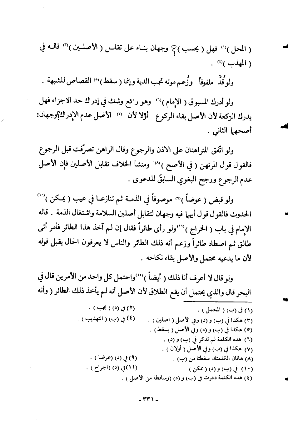 الْمَحَلِّ) فَهَلْ (يُحْسَبُ) ؟ وَجْهَانِ بِنَاءً عَلَى تَقَابُلِ (الْأَصْلَيْنِ) قَالَهُ فِي (الْمُهَذَّبِ) ، وَلَوْ قُدَّ مَلْفُوفًا وَزُعِمَ مَوْتُهُ تَجِبُ الدِّيَةُ، وَإِنَّمَا (سَقَطَ) الْقِصَاصُ لِلشُّبْهَةِ، وَلَوْ أَدْرَكَ الْمَسْبُوقُ (الْإِمَامَ) وَهُوَ رَاكِعٌ وَشَكَّ فِي إدْرَاكِ حَدِّ الْإِجْزَاءِ، فَهَلْ يُدْرِكُ الرَّكْعَةَ؛ لِأَنَّ الْأَصْلَ بَقَاءُ الرُّكُوعِ، أَوْ لَا؛ لِأَنَّ الْأَصْلَ عَدَمُ الْإِدْرَاكِ؟ وَجْهَانِ: أَصَحُّهُمَا الثَّانِي.