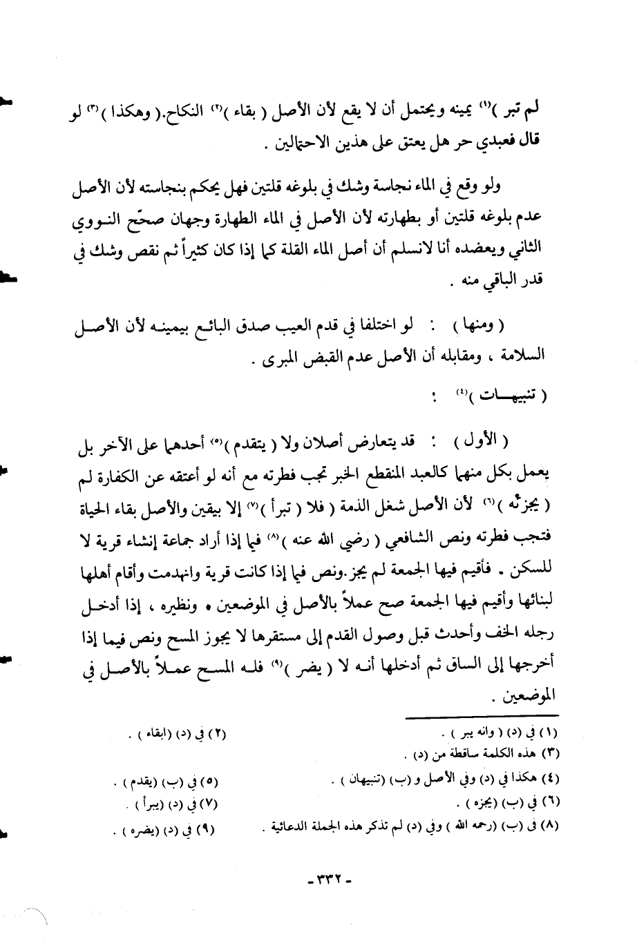 (تَنْبِيهَاتٌ) : (الْأَوَّلُ) : قَدْ يَتَعَارَضُ أَصْلَانِ وَلَا (يَتَقَدَّمُ) أَحَدُهُمَا عَلَى الْآخَرِ، بَلْ يُعْمَلُ بِكُلٍّ مِنْهُمَا كَالْعَبْدِ الْمُنْقَطِعِ الْخَبَرِ تَجِبُ فِطْرَتُهُ مَعَ أَنَّهُ لَوْ أَعْتَقَهُ عَنْ الْكَفَّارَةِ لَمْ (يُجْزِئُهُ) ؛ لِأَنَّ الْأَصْلَ شَغْلُ الذِّمَّةِ فَلَا (تَبْرَأُ) إلَّا بِيَقِينٍ، وَالْأَصْلُ بَقَاءُ الْحَيَاةِ فَتَجِبُ فِطْرَتُهُ، وَنَصُّ الشَّافِعِيِّ (- رَضِيَ اللَّهُ عَنْهُ -) فِيمَا إذَا أَرَادَ جَمَاعَةٌ إنْشَاءَ قَرْيَةٍ لَا لِلسَّكَنِ - فَأُقِيمَ فِيهَا الْجُمُعَةُ لَمْ يَجُزْ، وَنَصٌّ فِيمَا إذَا كَانَتْ قَرْيَةٌ وَانْهَدَمَتْ وَأَقَامَ أَهْلُهَا لِبِنَائِهَا وَأُقِيمَ فِيهَا الْجُمُعَةُ صَحَّ عَمَلًا بِالْأَصْلِ فِي الْمَوْضِعَيْنِ، وَنَظِيرُهُ، إذَا أَدْخَلَ رِجْلَهُ الْخُفَّ، وَأَحْدَثَ قَبْلَ وُصُولِ الْقَدَمِ إلَى مُسْتَقَرِّهَا لَا يَجُوزُ الْمَسْحُ، وَنَصٌّ فِيمَا إذَا أَخْرَجَهَا إلَى السَّاقِ ثُمَّ أَدْخَلَهَا أَنَّهُ لَا (يَضُرُّ) ، فَلَهُ الْمَسْحُ عَمَلًا بِالْأَصْلِ فِي الْمَوْضِعَيْنِ.