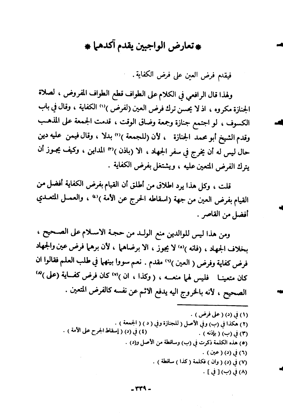 ِ يُقَدَّمُ آكَدُهُمَا فَيُقَدَّمُ فَرْضُ الْعَيْنِ عَلَى فَرْضِ الْكِفَايَةِ، وَلِهَذَا قَالَ الرَّافِعِيُّ فِي الْكَلَامِ عَلَى الطَّوَافِ: قَطْعُ الطَّوَافِ الْمَفْرُوضِ، لِصَلَاةِ الْجِنَازَةِ مَكْرُوهٌ، إذْ لَا يَحْسُنُ تَرْكُ فَرْضِ الْعَيْنِ (لِفَرْضِ) الْكِفَايَةِ، وَقَالَ فِي بَابِ الْكُسُوفِ: لَوْ اجْتَمَعَ جِنَازَةٌ وَجُمُعَةٌ وَضَاقَ الْوَقْتُ، قُدِّمَتْ الْجُمُعَةُ عَلَى الْمَذْهَبِ وَقَدَّمَ الشَّيْخُ أَبُو مُحَمَّدٍ الْجِنَازَةَ؛ لِأَنَّ (لِلْجُمُعَةِ) بَدَلًا، وَقَالَ فِيمَنْ عَلَيْهِ دَيْنٌ حَالٌّ لَيْسَ لَهُ أَنْ يَخْرُجَ فِي سَفَرِ الْجِهَادِ، إلَّا (بِإِذْنِ) الْمُدَايِنِ، وَكَيْفَ يَجُوزُ أَنْ يَتْرُكَ الْفَرْضَ الْمُتَعَيَّنَ عَلَيْهِ، وَيَشْتَغِلَ بِفَرْضِ الْكِفَايَةِ. قُلْت: وَكُلُّ هَذَا يَرُدُّ إطْلَاقَ مَنْ أَطْلَقَ أَنَّ الْقِيَامَ بِفَرْضِ الْكِفَايَةِ أَفْضَلُ مِنْ الْقِيَامِ بِفَرْضِ الْعَيْنِ مِنْ جِهَةِ (إسْقَاطِهِ الْحَرَجَ عَنْ الْأُمَّةِ) ، وَالْعَمَلُ الْمُتَعَدِّي أَفْضَلُ مِنْ الْقَاصِرِ، وَمِنْ هَذَا لَيْسَ لِلْوَالِدَيْنِ مَنْعُ الْوَلَدِ مِنْ حَجَّةِ الْإِسْلَامِ عَلَى الصَّحِيحِ، بِخِلَافِ الْجِهَادِ، (فَإِنَّهُ) لَا يَجُوزُ، إلَّا بِرِضَاهُمَا؛ لِأَنَّ بِرَّهُمَا فَرْضُ عَيْنٍ وَالْجِهَادُ فَرْضُ كِفَايَةٍ وَفَرْضُ (الْعَيْنِ) مُقَدَّمٌ.