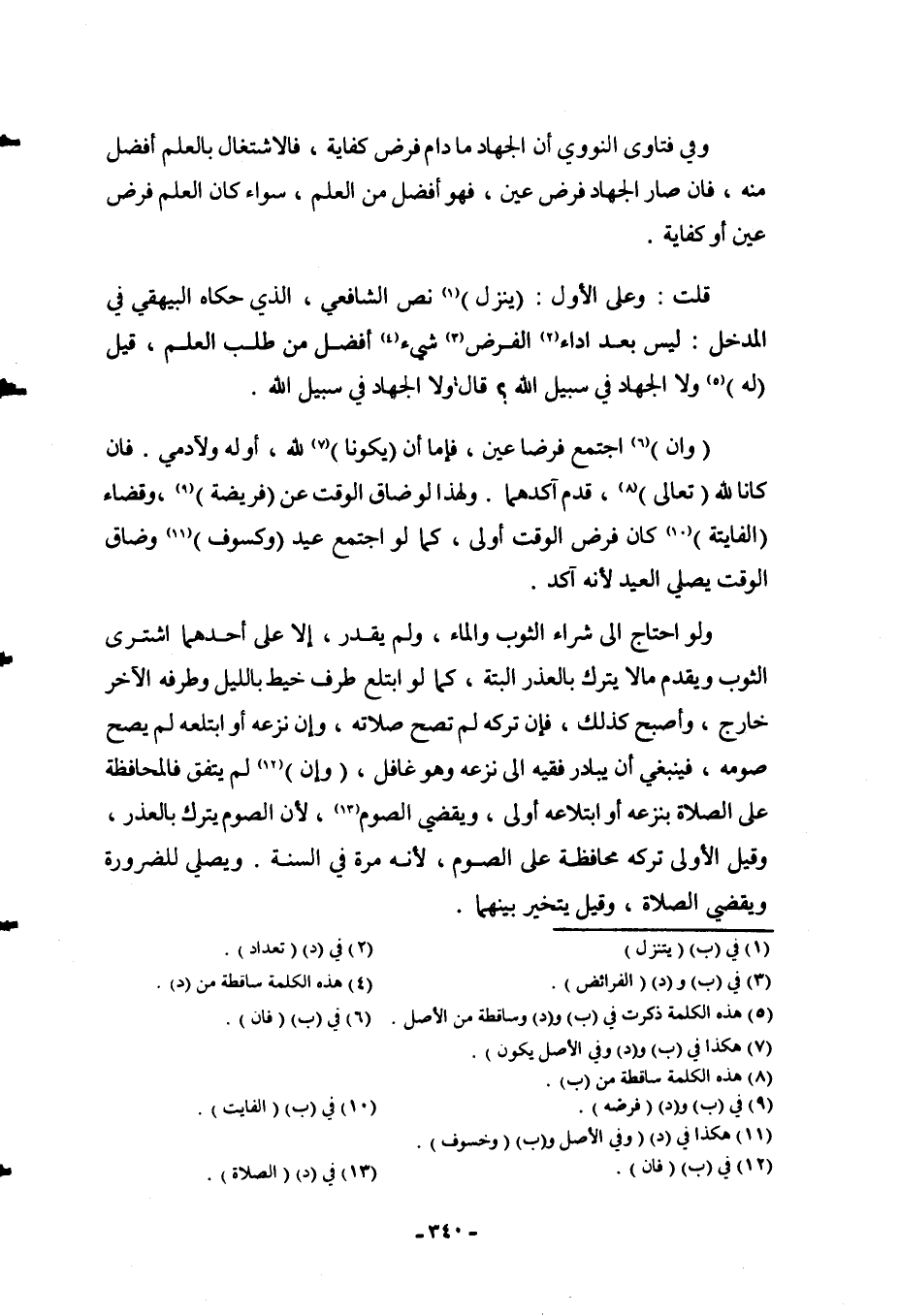 وَفِي فَتَاوَى النَّوَوِيِّ أَنَّ الْجِهَادَ مَا دَامَ فَرْضَ كِفَايَةٍ، فَالِاشْتِغَالُ بِالْعِلْمِ أَفْضَلُ مِنْهُ، فَإِنْ صَارَ الْجِهَادُ فَرْضَ عَيْنٍ، فَهُوَ أَفْضَلُ مِنْ الْعِلْمِ، سَوَاءٌ كَانَ الْعِلْمُ فَرْضَ عَيْنٍ أَوْ كِفَايَةٍ. قُلْت: وَعَلَى الْأَوَّلِ (يَنْزِلُ) نَصُّ الشَّافِعِيِّ، الَّذِي حَكَاهُ الْبَيْهَقِيُّ فِي الْمَدْخَلِ: لَيْسَ بَعْدَ أَدَاءِ الْفَرْضِ شَيْءٌ أَفْضَلُ مِنْ طَلَبِ الْعِلْمِ، قِيلَ (لَهُ) : وَلَا الْجِهَادُ فِي سَبِيلِ اللَّهِ؟ قَالَ: وَلَا الْجِهَادُ فِي سَبِيلِ اللَّهِ.