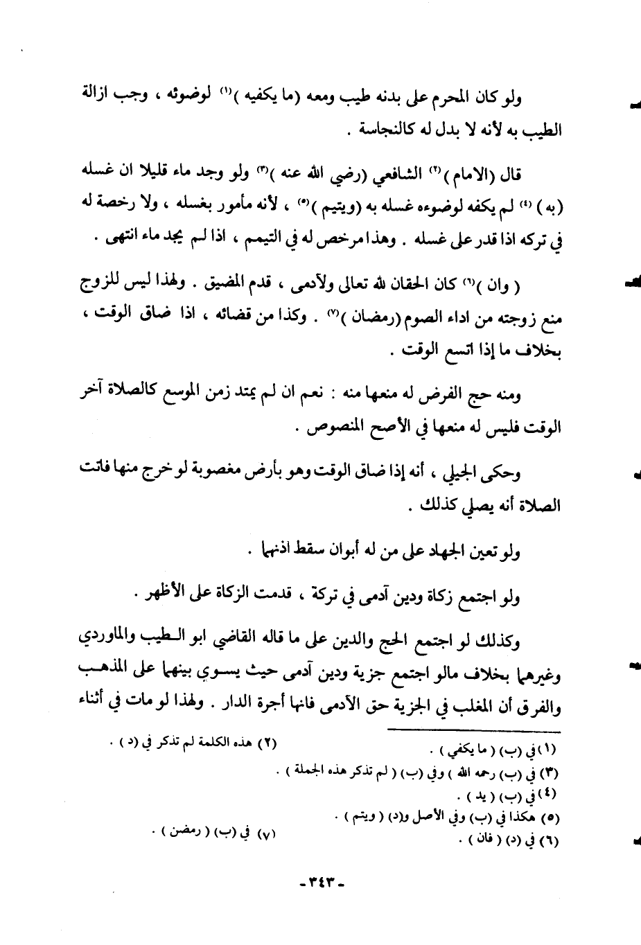 وَلَوْ كَانَ الْمُحْرِمُ عَلَى بَدَنِهِ طِيبٌ وَمَعَهُ (مَا يَكْفِيه) لِوُضُوئِهِ، وَجَبَ إزَالَةُ الطِّيبِ بِهِ؛ لِأَنَّهُ لَا بَدَلَ لَهُ كَالنَّجَاسَةِ، قَالَ (الْإِمَامُ) الشَّافِعِيُّ (- رَضِيَ اللَّهُ عَنْهُ -) ، وَلَوْ وَجَدَ مَاءً قَلِيلًا إنْ غَسَلَهُ (بِهِ) لَمْ يَكْفِهِ لِوُضُوئِهِ غَسَلَهُ بِهِ (وَيَتَيَمَّمُ) ؛ لِأَنَّهُ مَأْمُورٌ بِغَسْلِهِ، وَلَا رُخْصَةَ لَهُ فِي تَرْكِهِ إذَا قَدَرَ عَلَى غَسْلِهِ، وَهَذَا مُرَخَّصٌ لَهُ فِي التَّيَمُّمِ، إذَا لَمْ يَجِدْ مَاءً انْتَهَى.