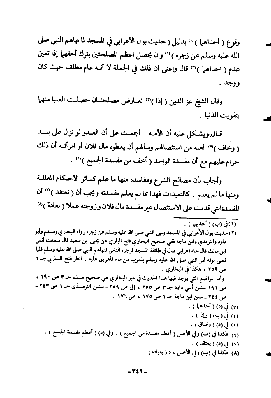 وُقُوعُ (إحْدَاهُمَا) بِدَلِيلِ (حَدِيثِ «بَوْلِ الْأَعْرَابِيِّ فِي الْمَسْجِدِ لَمَّا نَهَاهُمْ النَّبِيُّ - صَلَّى اللَّهُ عَلَيْهِ وَسَلَّمَ - عَنْ زَجْرِهِ» ) وَأَنْ يَحْصُلَ أَعْظَمُ الْمَصْلَحَتَيْنِ بِتَرْكِ أَخَفِّهِمَا إذَا تَعَيَّنَ عَدَمُ (إحْدَاهُمَا) قَالَ وَأَعْنِي أَنَّ ذَلِكَ فِي الْجُمْلَةِ لَا أَنَّهُ عَامٌّ مُطْلَقًا حَيْثُ كَانَ وَوُجِدَ.