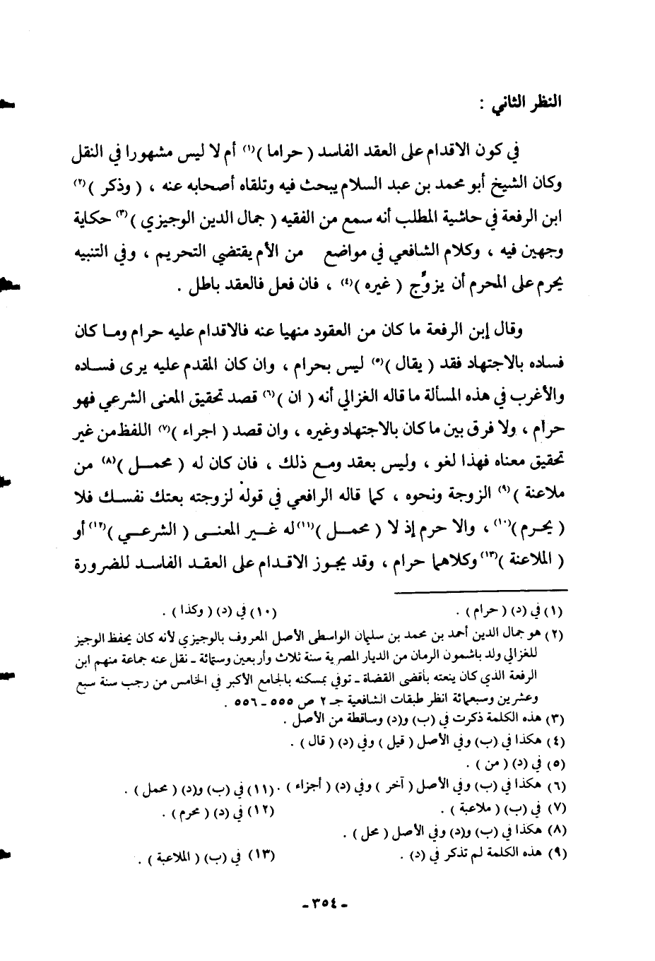 النَّظَرُ الثَّانِي: فِي كَوْنِ الْإِقْدَامِ عَلَى الْعَقْدِ الْفَاسِدِ (حَرَامًا) أَمْ لَا؟ لَيْسَ مَشْهُورًا فِي النَّقْلِ وَكَانَ الشَّيْخُ أَبُو مُحَمَّدِ بْنِ عَبْدِ السَّلَامِ يَبْحَثُ فِيهِ وَتَلَقَّاهُ أَصْحَابُهُ عَنْهُ، (وَذَكَرَ) ابْنُ الرِّفْعَةِ فِي حَاشِيَةِ الْمَطْلَبِ أَنَّهُ سَمِعَ مِنْ الْفَقِيهِ (جَمَالِ الدِّينِ الْوَجِيزِيِّ) حِكَايَةَ وَجْهَيْنِ فِيهِ، وَكَلَامُ الشَّافِعِيِّ فِي مَوَاضِعَ مِنْ الْأُمِّ يَقْتَضِي التَّحْرِيمَ، وَفِي التَّنْبِيهِ يَحْرُمُ عَلَى الْمُحْرِمِ أَنْ يُزَوِّجَ (غَيْرَهُ) ، فَإِنْ فَعَلَ فَالْعَقْدُ بَاطِلٌ وَقَالَ ابْنُ الرِّفْعَةِ: مَا كَانَ مِنْ الْعُقُودِ مَنْهِيًّا عَنْهُ فَالْإِقْدَامُ عَلَيْهِ حَرَامٌ، وَمَا كَانَ فَسَادُهُ بِالِاجْتِهَادِ فَقَدْ (يُقَالُ) : لَيْسَ بِحَرَامٍ، وَإِنْ كَانَ الْمُقَدَّمُ عَلَيْهِ يَرَى فَسَادَهُ وَالْأَغْرَبُ فِي هَذِهِ الْمَسْأَلَةِ مَا قَالَهُ الْغَزَالِيُّ: إنَّهُ (إنْ) قَصَدَ تَحْقِيقَ الْمَعْنَى الشَّرْعِيِّ فَهُوَ حَرَامٌ، وَلَا فَرْقَ بَيْنَ مَا كَانَ بِالِاجْتِهَادِ وَغَيْرِهِ، وَإِنْ قَصَدَ (إجْرَاءَ) اللَّفْظِ مِنْ غَيْرِ تَحْقِيقِ مَعْنَاهُ فَهَذَا لَغْوٌ، وَلَيْسَ بِعَقْدٍ وَمَعَ ذَلِكَ، فَإِنْ كَانَ لَهُ (مَحْمَلٌ) مِنْ (مُلَاعَنَةِ) الزَّوْجَةِ وَنَحْوِهِ، كَمَا قَالَهُ الرَّافِعِيُّ فِي قَوْلِهِ لِزَوْجَتِهِ: بِعْتُك نَفْسَك فَلَا (يُحَرَّمُ) ، وَإِلَّا حُرِّمَ إذْ لَا (مَحْمَلَ) لَهُ غَيْرُ الْمَعْنَى (الشَّرْعِيِّ) أَوْ (الْمُلَاعَنَةِ) وَكِلَاهُمَا حَرَامٌ، وَقَدْ يَجُوزُ الْإِقْدَامُ عَلَى الْعَقْدِ الْفَاسِدِ لِلضَّرُورَةِ