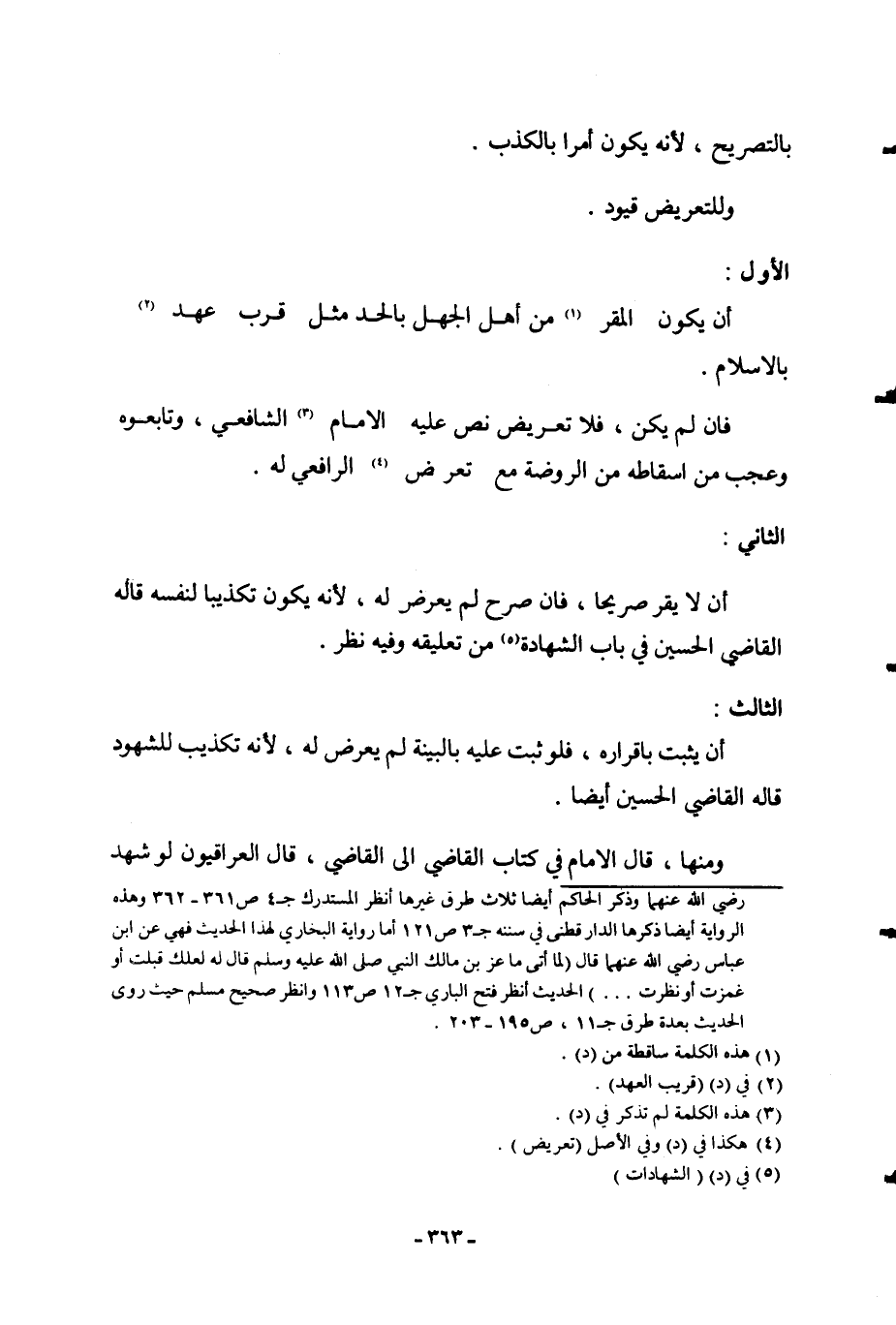الْأَوَّلُ: أَنْ يَكُونَ الْمُقِرُّ مِنْ أَهْلِ الْجَهْلِ بِالْحَدِّ مِثْلَ قُرْبِ عَهْدٍ بِالْإِسْلَامِ. فَإِنْ لَمْ يَكُنْ، فَلَا تَعْرِيضَ نَصَّ عَلَيْهِ الْإِمَامُ الشَّافِعِيُّ، وَتَابِعُوهُ وَعَجِبَ مِنْ إسْقَاطِهِ مِنْ الرَّوْضَةِ مَعَ تَعَرُّضِ الرَّافِعِيِّ لَهُ.