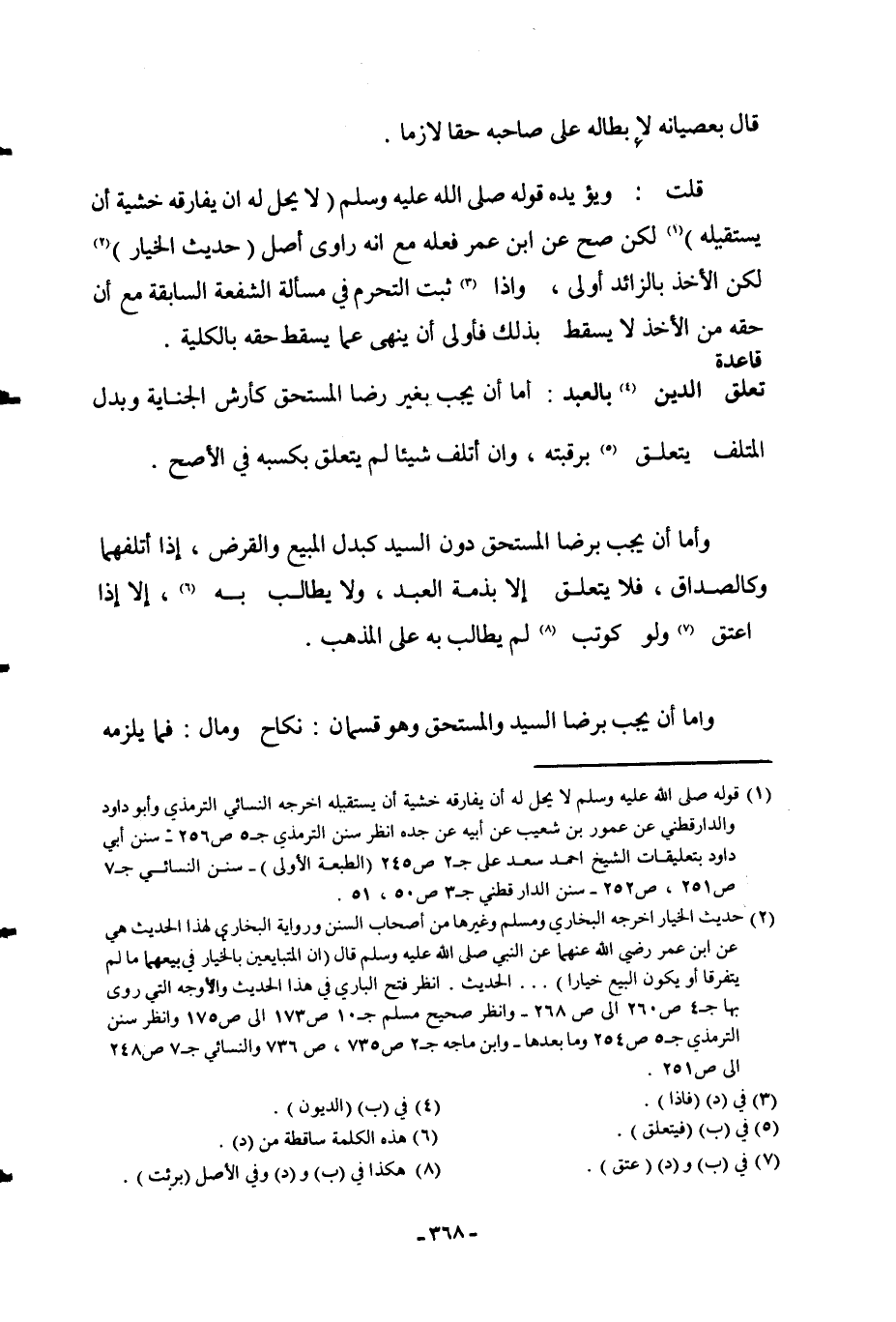 قَالَ بِعِصْيَانِهِ لِإِبْطَالِهِ عَلَى صَاحِبِهِ حَقًّا لَازِمًا. قُلْت: وَيُؤَيِّدُهُ قَوْلُهُ - صَلَّى اللَّهُ عَلَيْهِ وَسَلَّمَ - «لَا يَحِلُّ لَهُ أَنْ يُفَارِقَهُ خَشْيَةَ أَنْ يَسْتَقِيلَهُ» لَكِنْ صَحَّ عَنْ ابْنِ عُمَرَ فِعْلُهُ مَعَ أَنَّهُ رَاوِي أَصْلِ (حَدِيثِ الْخِيَارِ) لَكِنْ الْأَخْذُ بِالزَّائِدِ أَوْلَى، وَإِذَا ثَبَتَ التَّحَرُّمُ فِي مَسْأَلَةِ الشُّفْعَةِ السَّابِقَةِ مَعَ أَنَّ حَقَّهُ مِنْ الْأَخْذِ لَا يَسْقُطُ بِذَلِكَ فَأَوْلَى أَنْ يَنْهَى عَمَّا يُسْقِطُ حَقَّهُ بِالْكُلِّيَّةِ.