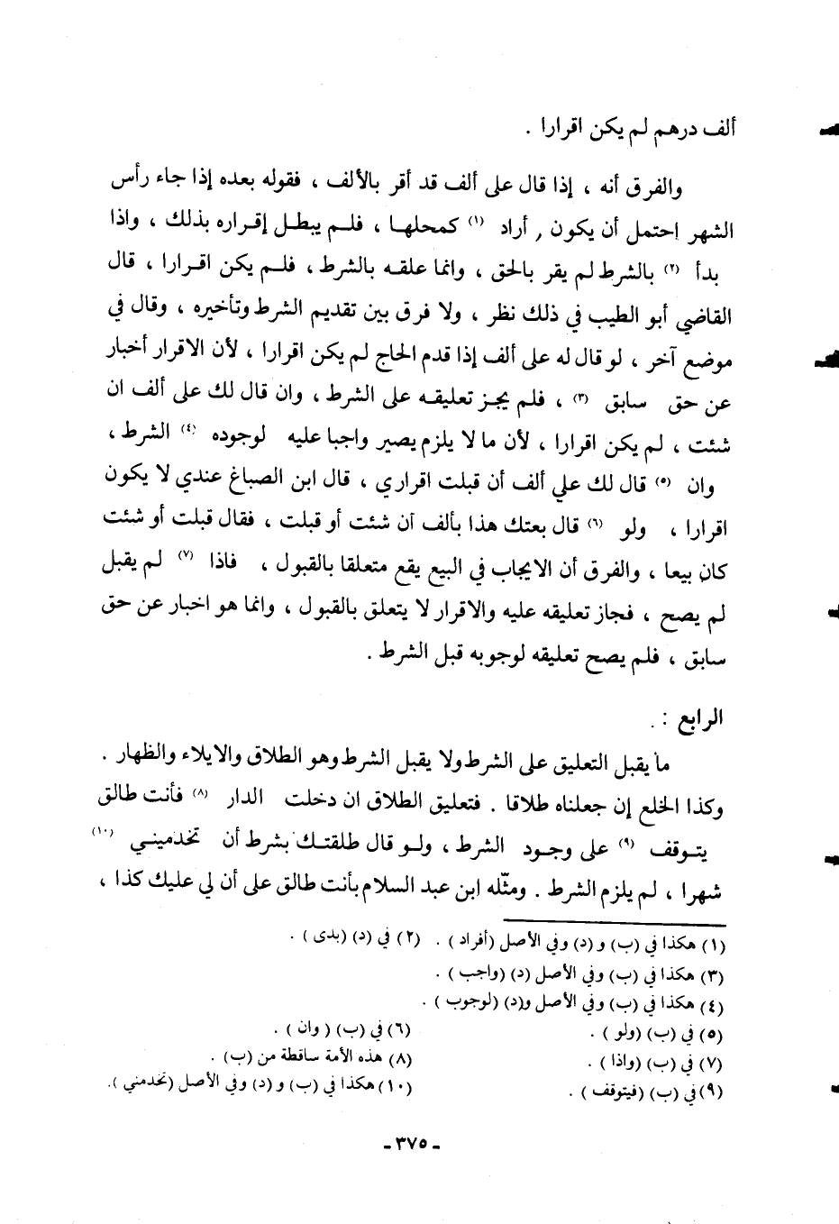 الرَّابِعُ: مَا يَقْبَلُ التَّعْلِيقَ عَلَى الشَّرْطِ وَلَا يَقْبَلُ الشَّرْطَ وَهُوَ الطَّلَاقُ وَالْإِيلَاءُ وَالظِّهَارُ. وَكَذَا الْخُلْعُ إنْ جَعَلْنَاهُ طَلَاقًا. فَتَعْلِيقُ الطَّلَاقِ إنْ دَخَلْتِ الدَّارَ فَأَنْتِ طَالِقٌ يَتَوَقَّفُ عَلَى وُجُودِ الشَّرْطِ، وَلَوْ قَالَ طَلَّقْتُك بِشَرْطِ أَنْ تَخْدُمِينِي شَهْرًا، لَمْ يَلْزَمْ الشَّرْطُ.