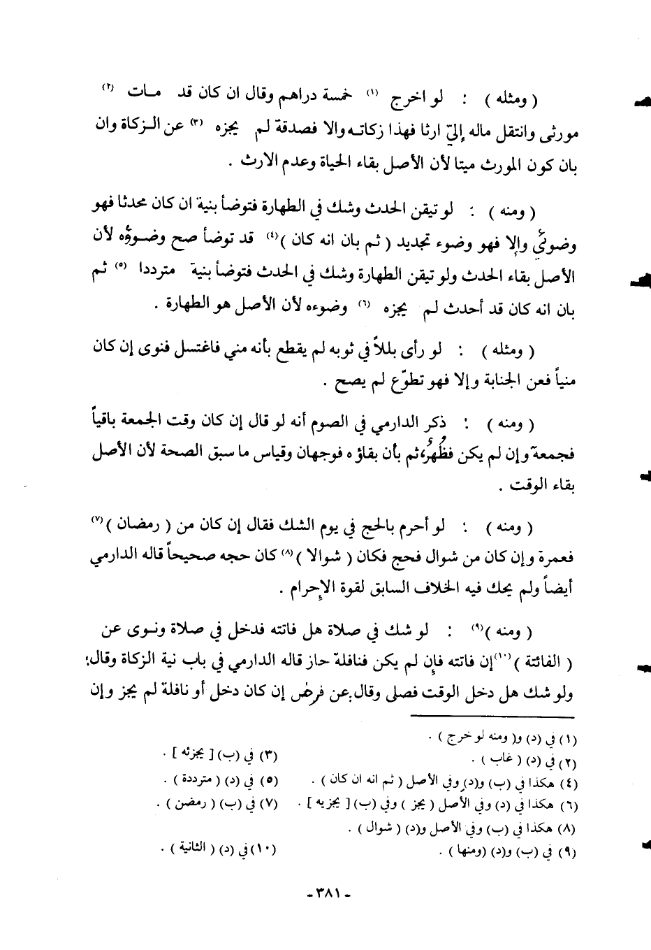 (وَمِنْهُ) ذَكَرَ الدَّارِمِيُّ فِي الصَّوْمِ أَنَّهُ لَوْ قَالَ إنْ كَانَ وَقْتُ الْجُمُعَةِ بَاقِيًا فَجُمُعَةٌ وَإِنْ لَمْ يَكُنْ فَظُهْرٌ ثُمَّ بَانَ بَقَاؤُهُ فَوَجْهَانِ وَقِيَاسُ مَا سَبَقَ الصِّحَّةُ لِأَنَّ الْأَصْلَ بَقَاءُ الْوَقْتِ.