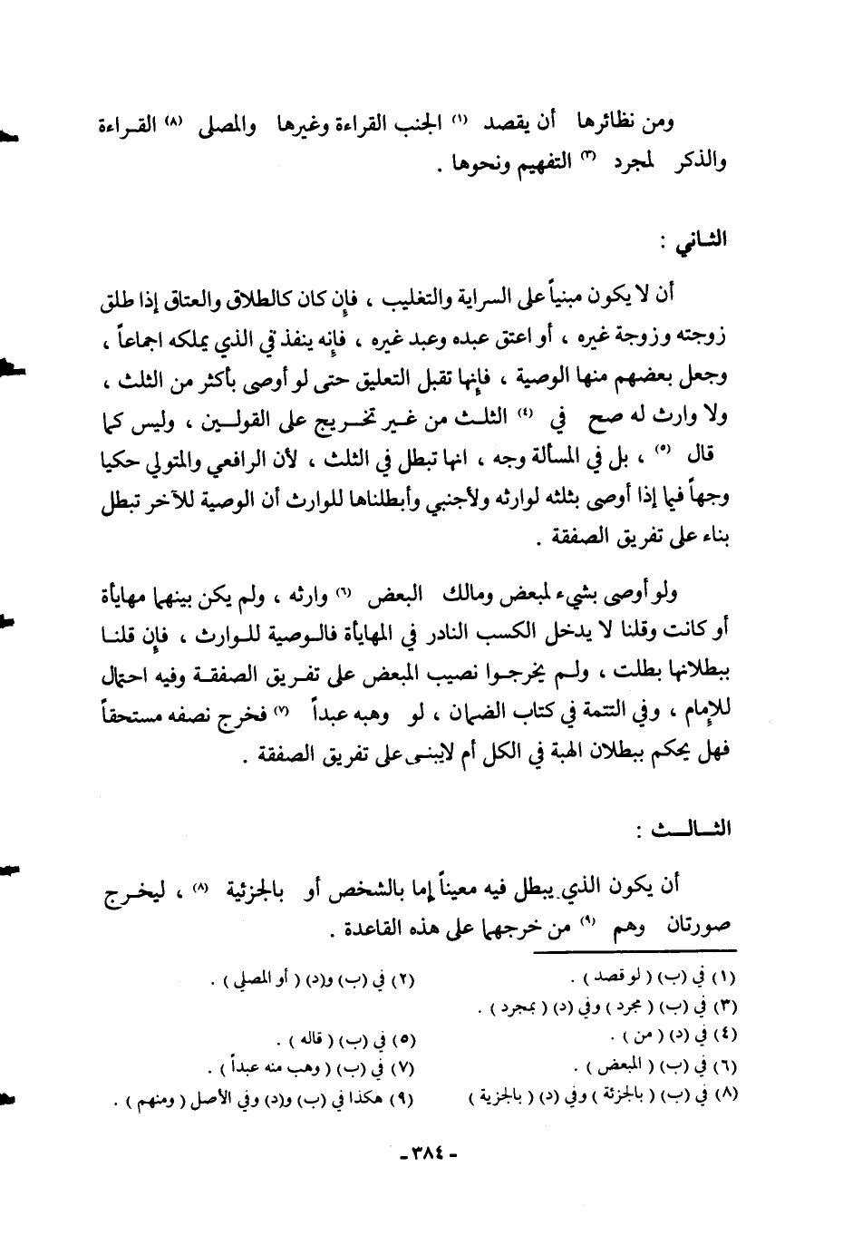 وَالثَّانِي: أَنْ لَا يَكُونَ مَبْنِيًّا عَلَى السِّرَايَةِ وَالتَّغْلِيبِ، فَإِنْ كَانَ كَالطَّلَاقِ وَالْعَتَاقِ إذَا طَلَّقَ زَوْجَتَهُ وَزَوْجَةَ غَيْرِهِ، أَوْ أَعْتَقَ عَبْدَهُ وَعَبْدَ غَيْرِهِ، فَإِنَّهُ يَنْفُذُ فِي الَّذِي يَمْلِكُهُ إجْمَاعًا، وَجَعَلَ بَعْضُهُمْ مِنْهَا الْوَصِيَّةَ، فَإِنَّهَا تَقْبَلُ التَّعْلِيقَ حَتَّى لَوْ أَوْصَى بِأَكْثَرَ مِنْ الثُّلُثِ، وَلَا وَارِثَ لَهُ صَحَّ فِي الثُّلُثِ مِنْ غَيْرِ تَخْرِيجٍ عَلَى الْقَوْلَيْنِ، وَلَيْسَ كَمَا قَالَ، بَلْ فِي الْمَسْأَلَةِ وَجْهٌ، أَنَّهَا تُبْطِلُ الثُّلُثَ، لِأَنَّ الرَّافِعِيَّ وَالْمُتَوَلِّيَ حَكَيَا وَجْهًا فِيمَا إذَا أَوْصَى بِثُلُثِهِ لِوَارِثِهِ وَلِأَجْنَبِيٍّ وَأَبْطَلْنَاهَا لِلْوَارِثِ أَنَّ الْوَصِيَّةَ لِلْآخَرِ تَبْطُلُ بِنَاءً عَلَى تَفْرِيقِ الصَّفْقَةِ.