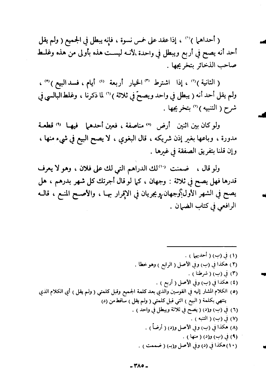 (الثَّانِيَةُ) ، إذَا اشْتَرَطَ الْخِيَارَ أَرْبَعَةَ أَيَّامٍ، (فَسَدَ الْبَيْعُ) ، وَلَمْ يَقُلْ أَحَدٌ أَنَّهُ (يَبْطُلُ فِي وَاحِدٍ وَيَصِحُّ فِي ثَلَاثَةٍ) لِمَا ذَكَرْنَا، وَغَلِطَ الْبَالِسِيُّ فِي (شَرْحِ التَّنْبِيهِ) بِتَخْرِيجِهَا. وَلَوْ كَانَ بَيْنَ اثْنَيْنِ أَرْضٌ مُنَاصَفَةً، فَعَيَّنَ أَحَدُهُمَا فِيهَا قِطْعَةً مُدَوَّرَةً، وَبَاعَهَا بِغَيْرِ إذْنِ شَرِيكِهِ، قَالَ الْبَغَوِيّ، لَا يَصِحُّ الْبَيْعُ فِي شَيْءٍ مِنْهَا، وَإِنْ قُلْنَا بِتَفْرِيقِ الصَّفْقَةِ فِي غَيْرِهَا.