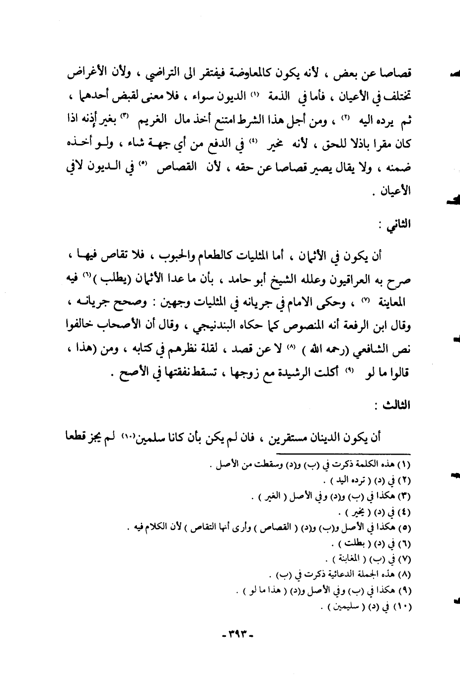 الثَّانِي: أَنْ يَكُونَ فِي الْأَثْمَانِ، أَمَّا الْمِثْلِيَّاتُ كَالطَّعَامِ وَالْحُبُوبِ، فَلَا تَقَاصَّ فِيهَا، صَرَّحَ بِهِ الْعِرَاقِيُّونَ وَعَلَّلَهُ الشَّيْخُ أَبُو حَامِدٍ، بِأَنَّ مَا عَدَا الْأَثْمَانَ (يَطْلُبُ) فِيهِ الْمُعَايَنَةَ، وَحَكَى الْإِمَامُ فِي جَرَيَانِهِ فِي الْمِثْلِيَّاتِ وَجْهَيْنِ: وَصَحَّحَ جَرَيَانُهُ، وَقَالَ ابْنُ الرِّفْعَةِ أَنَّهُ الْمَنْصُوصُ كَمَا حَكَاهُ الْبَنْدَنِيجِيُّ، وَقَالَ إنَّ الْأَصْحَابَ خَالَفُوا نَصَّ الشَّافِعِيِّ (- رَحِمَهُ اللَّهُ -) لَا عَنْ قَصْدٍ، لِقِلَّةِ نَظَرِهِمْ فِي كِتَابِهِ، وَمِنْ (هَذَا، قَالُوا مَا لَوْ) أَكَلَتْ الرَّشِيدَةُ مَعَ زَوْجِهَا، تُسْقِطُ نَفَقَتَهَا فِي الْأَصَحِّ.