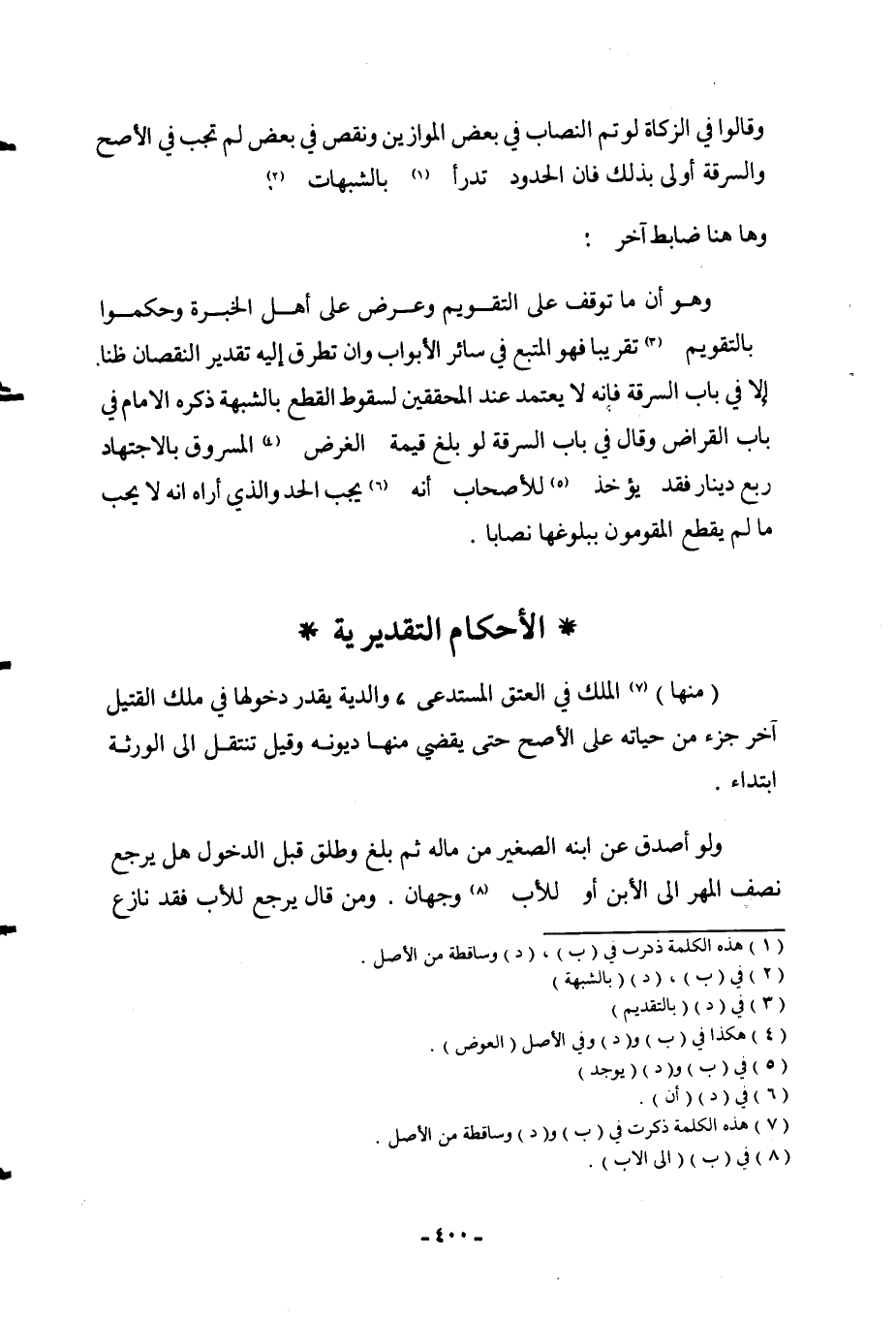 الْأَحْكَامُ التَّقْدِيرِيَّةُ (مِنْهَا) الْمِلْكُ فِي الْعِتْقِ الْمُسْتَدْعَى، وَالدِّيَةُ يُقَدَّرُ دُخُولُهَا فِي مِلْكِ الْقَتِيلِ آخِرَ جُزْءٍ مِنْ حَيَاتِهِ عَلَى الْأَصَحِّ حَتَّى يَقْضِيَ مِنْهَا دُيُونَهُ وَقِيلَ: تَنْتَقِلُ إلَى الْوَرَثَةِ ابْتِدَاءً.