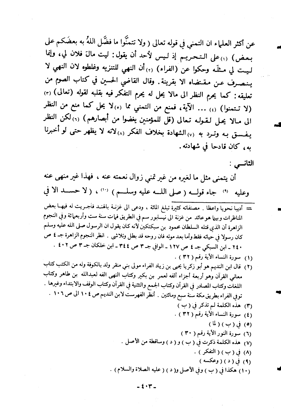عَنْ أَكْثَرِ الْعُلَمَاءِ أَنَّ التَّمَنِّيَ فِي قَوْله تَعَالَى {وَلا تَتَمَنَّوْا مَا فَضَّلَ اللَّهُ بِهِ بَعْضَكُمْ عَلَى بَعْضٍ} [النساء: ٣٢] عَلَى التَّحْرِيمِ إذْ لَيْسَ لِأَحَدٍ أَنْ يَقُولَ: لَيْتَ مَالَ فُلَانٍ لِي، وَإِنَّمَا لَيْتَ لِي مِثْلَهُ وَحَكَوْا عَنْ (الْفَرَّاءِ) أَنَّ النَّهْيَ لِلتَّنْزِيهِ وَغَلَّطُوهُ لِأَنَّ النَّهْيَ لَا يَنْصَرِفُ عَنْ مُقْتَضَاهُ إلَّا بِقَرِينَةٍ.