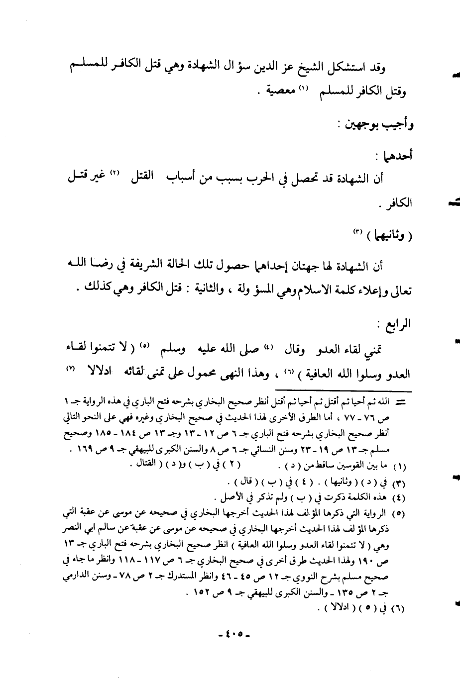 وَقَدْ اسْتَشْكَلَ الشَّيْخُ عِزُّ الدِّينِ سُؤَالَ الشَّهَادَةِ وَهِيَ قَتْلُ الْكَافِرِ لِلْمُسْلِمِ، وَقَتْلُ الْكَافِرِ لِلْمُسْلِمِ مَعْصِيَةٌ.