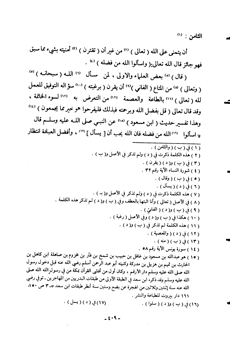 الثَّامِنُ: أَنْ يَتَمَنَّى عَلَى اللَّهِ (تَعَالَى) مِنْ غَيْرِ أَنْ (تَقْتَرِنَ) أُمْنِيَّتُهُ بِشَيْءٍ مِمَّا سَبَقَ فَهُوَ جَائِزٌ قَالَ اللَّهُ تَعَالَى: {وَاسْأَلُوا اللَّهَ مِنْ فَضْلِهِ} [النساء: ٣٢] .