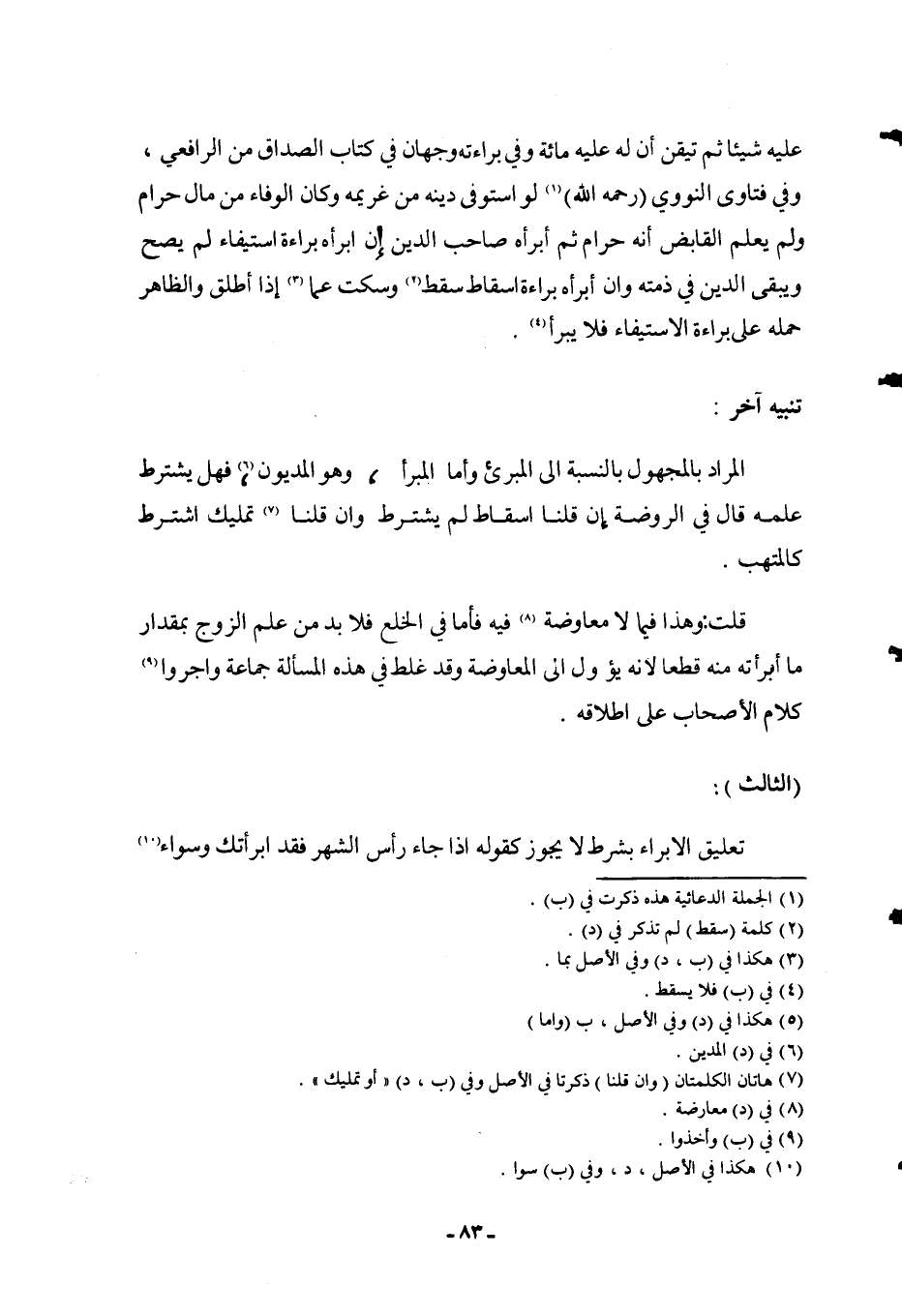 (الثَّالِثُ) : تَعْلِيقُ الْإِبْرَاءِ بِشَرْطٍ لَا يَجُوزُ كَقَوْلِهِ إذَا جَاءَ رَأْسُ الشَّهْرِ فَقَدْ أَبْرَأْتُك، وَسَوَاءٌ