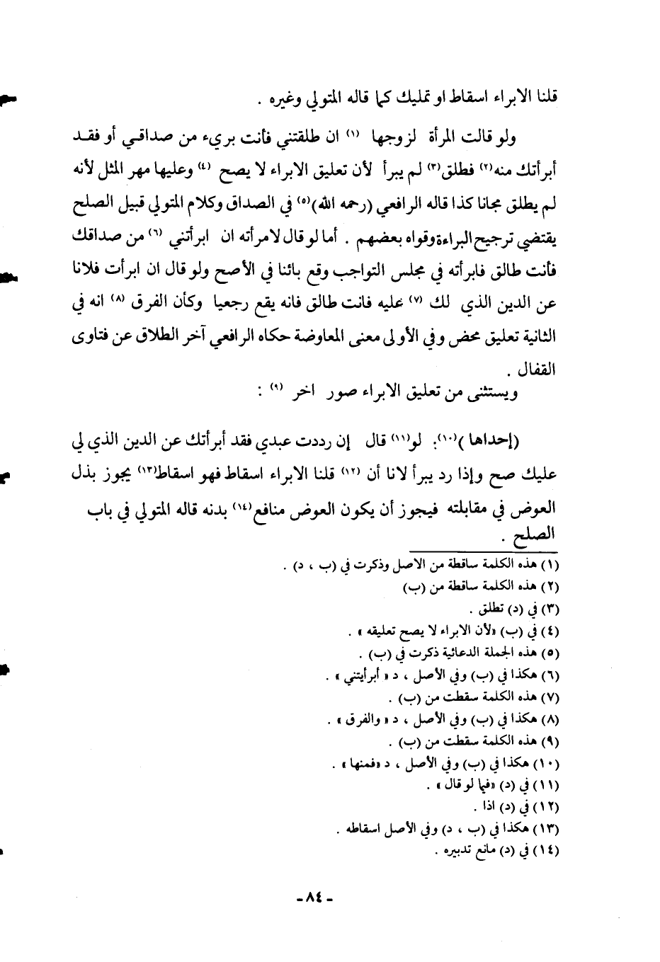 قُلْنَا الْإِبْرَاءُ إسْقَاطٌ أَوْ تَمْلِيكٌ كَمَا قَالَهُ الْمُتَوَلِّي وَغَيْرُهُ. وَلَوْ قَالَتْ الْمَرْأَةُ لِزَوْجِهَا إنْ طَلَّقْتنِي فَأَنْتَ بَرِيءٌ مِنْ صَدَاقِي أَوْ فَقَدْ أَبْرَأْتُك مِنْهُ فَطَلَّقَ لَمْ يَبْرَأْ لِأَنَّ تَعْلِيقَ الْإِبْرَاءِ لَا يَصِحُّ وَعَلَيْهَا مَهْرُ الْمِثْلِ لِأَنَّهُ لَمْ يُطَلِّقْ مَجَّانًا كَذَا قَالَهُ الرَّافِعِيُّ (- رَحِمَهُ اللَّهُ -) فِي الصَّدَاقِ وَكَلَامُ الْمُتَوَلِّي قُبَيْلَ الصُّلْحِ يَقْتَضِي تَرْجِيحَ الْبَرَاءَةِ وَقَوَّاهُ بَعْضُهُمْ. أَمَّا لَوْ قَالَ لِامْرَأَتِهِ إنْ أَبْرَأْتنِي مِنْ صَدَاقِك فَأَنْتِ طَالِقٌ فَأَبْرَأَتْهُ فِي مَجْلِسِ التَّوَاجُبِ وَقَعَ بَائِنًا فِي الْأَصَحِّ، وَلَوْ قَالَ إنْ أَبْرَأْت فُلَانًا عَنْ الدَّيْنِ الَّذِي لَك عَلَيْهِ فَأَنْتِ طَالِقٌ فَإِنَّهُ يَقَعُ رَجْعِيًّا وَكَأَنَّ الْفَرْقَ أَنَّهُ فِي الثَّانِيَةِ تَعْلِيقٌ مَحْضٌ وَفِي الْأُولَى مَعْنَى الْمُعَاوَضَةِ حَكَاهُ الرَّافِعِيُّ آخِرَ الطَّلَاقِ عَنْ فَتَاوَى الْقَفَّالِ.