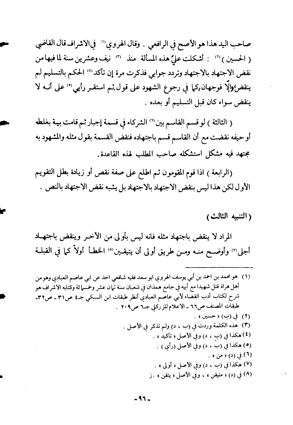(التَّنْبِيهُ الثَّالِثُ) الْمُرَادُ لَا يُنْقَضُ بِاجْتِهَادٍ مِثْلِهِ فَإِنَّهُ لَيْسَ بِأَوْلَى مِنْ الْآخَرِ وَيُنْقَضُ بِاجْتِهَادٍ أَجْلَى وَأَوْضَحَ مِنْهُ وَمِنْ طَرِيقٍ أَوْلَى أَنْ يَتَيَقَّنَ الْخَطَأَ أَوْ لَا كَمَا فِي الْقِبْلَةِ