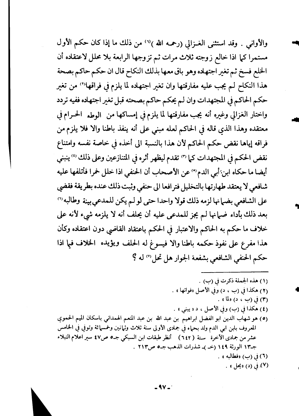 وَالْأَوَانِي. وَقَدْ اسْتَثْنَى الْغَزَالِيُّ (- رَحِمَهُ اللَّهُ -) مِنْ ذَلِكَ مَا إذَا كَانَ حُكْمُ الْأَوَّلِ مُسْتَمِرًّا كَمَا إذَا خَالَعَ زَوْجَتَهُ ثَلَاثَ مَرَّاتٍ ثُمَّ تَزَوَّجَهَا الرَّابِعَةَ بِلَا مُحَلِّلٍ لِاعْتِقَادِهِ أَنَّ الْخُلْعَ فَسْخٌ ثُمَّ تَغَيَّرَ اجْتِهَادُهُ وَهُوَ بَاقٍ مَعَهَا بِذَلِكَ النِّكَاحِ قَالَ إنْ حَكَمَ حَاكِمٌ بِصِحَّةِ هَذَا النِّكَاحِ لَمْ يَجِبْ عَلَيْهِ مُفَارَقَتُهَا وَإِنْ تَغَيَّرَ اجْتِهَادُهُ لِمَا يَلْزَمُ فِي فِرَاقِهَا مِنْ تَغَيُّرِ حُكْمِ الْحَاكِمِ فِي الْمُجْتَهَدَاتِ وَإِنْ لَمْ يَحْكُمْ حَاكِمٌ بِصِحَّتِهِ قَبْلَ تَغَيُّرِ اجْتِهَادِهِ فَفِيهِ تَرَدُّدٌ وَاخْتَارَ الْغَزَالِيُّ وَغَيْرُهُ أَنَّهُ يَجِبُ مُفَارَقَتُهَا لِمَا يَلْزَمُ فِي إمْسَاكِهَا مِنْ الْوَطْءِ الْحَرَامِ فِي مُعْتَقَدِهِ وَهَذَا الَّذِي قَالَهُ فِي الْحَاكِمِ لَعَلَّهُ مَبْنِيٌّ عَلَى أَنَّهُ يَنْفُذُ بَاطِنًا وَإِلَّا فَلَا يَلْزَمُ مِنْ فِرَاقِهِ إيَّاهَا نَقْضُ حُكْمِ الْحَاكِمِ لِأَنَّ هَذَا بِالنِّسْبَةِ إلَى أَخْذِهِ فِي خَاصَّةِ نَفْسِهِ وَامْتِنَاعِ نَقْضِ الْحُكْمِ فِي الْمُجْتَهَدَاتِ كَمَا تَقَدَّمَ لِيَظْهَرَ أَثَرُهُ فِي الْمُتَنَازِعَيْنِ وَعَلَى ذَلِكَ يَنْبَنِي أَيْضًا مَا حَكَاهُ ابْنُ أَبِي الدَّمِ عَنْ الْأَصْحَابِ أَنَّ الْحَنَفِيَّ إذَا خَلَّلَ خَمْرًا فَأَتْلَفَهَا عَلَيْهِ شَافِعِيٌّ لَا يَعْتَقِدُ طَهَارَتَهَا بِالتَّخْلِيلِ فَتَرَافَعَا إلَى حَنَفِيٍّ وَثَبَتَ ذَلِكَ عِنْدَهُ بِطَرِيقَةٍ فَقَضَى عَلَى الشَّافِعِيِّ بِضَمَانِهَا لَزِمَهُ ذَلِكَ قَوْلًا وَاحِدًا حَتَّى لَوْ لَمْ يَكُنْ لِلْمُدَّعِي بَيِّنَةٌ وَطَالَبَهُ بَعْدَ ذَلِكَ بِأَدَاءِ ضَمَانِهَا لَمْ يَجُزْ لِلْمُدَّعَى عَلَيْهِ أَنْ يَحْلِفَ أَنَّهُ لَا يَلْزَمُهُ شَيْءٌ لِأَنَّهُ عَلَى خِلَافِ مَا حَكَمَ بِهِ الْحَاكِمُ وَالِاعْتِبَارُ فِي الْحُكْمِ بِاعْتِقَادِ الْقَاضِي دُونَ اعْتِقَادِهِ وَكَأَنَّ هَذَا مُفَرَّعٌ عَلَى نُفُوذِ حُكْمِهِ بَاطِنًا وَإِلَّا فَيُسَوَّغُ لَهُ الْحَلِفُ وَيُؤَيِّدُهُ الْخِلَافُ فِيمَا إذَا حَكَمَ الْحَنَفِيُّ لِلشَّافِعِيِّ بِشُفْعَةِ الْجِوَارِ هَلْ تَحِلُّ لَهُ؟