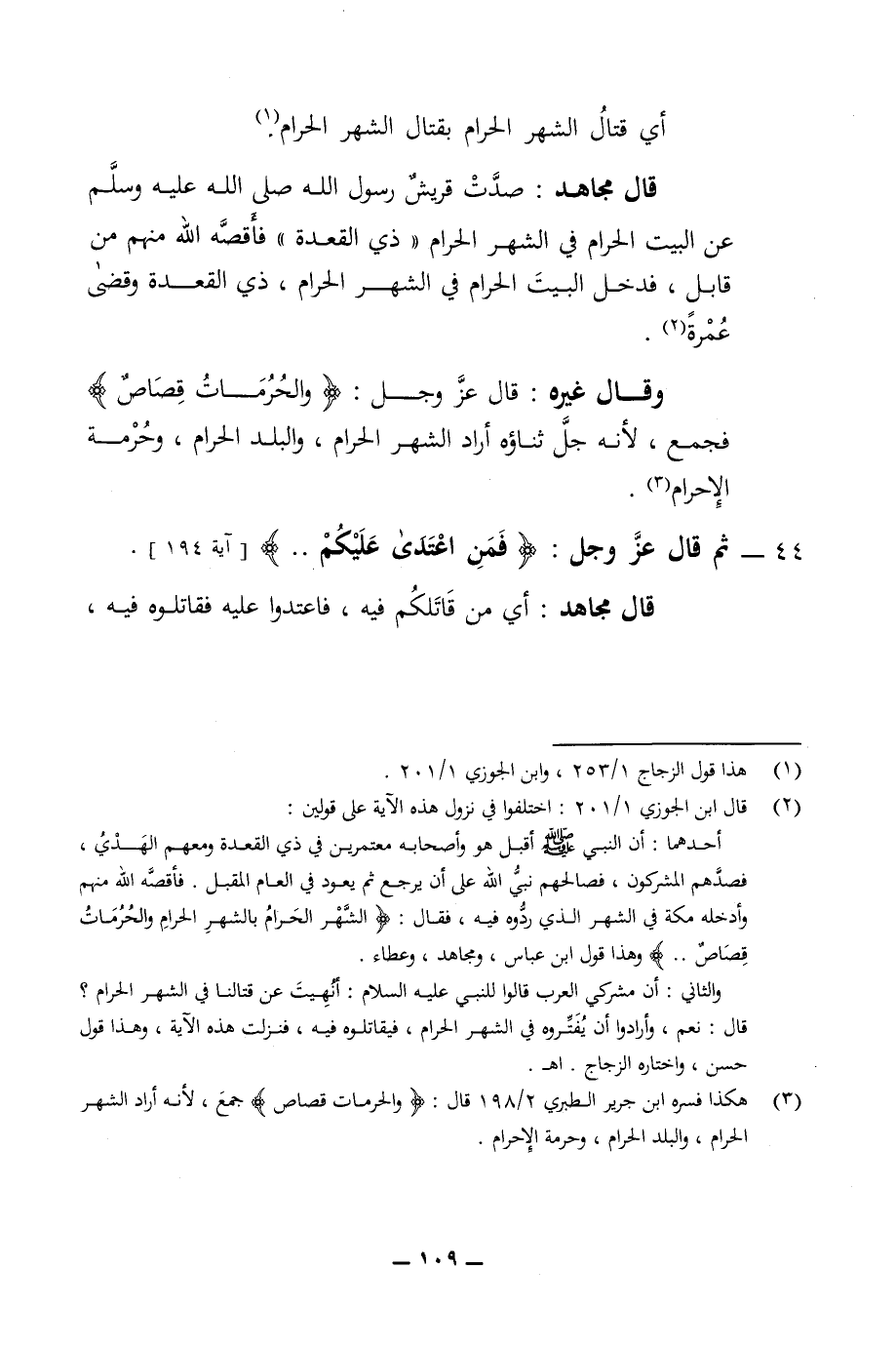 أي قتال الشهر الحرام بقتال الشهر الحرام قال مجاهد صدت قريش رسول الله صلى الله عليه وسلم عن البيت الحرام في الشهر الحرام ذي القعدة فأقضه الله منهم من قابل فدخل البيت الحرام في الشهر الحرام ذي القعدة وقضى عمرة وقال غيره قال الله عز وجل والحرمات قصاص فجمع لانه جل ثناؤه أراد الشهر الحرام والبلد الحرام وحرمة الإحرام 44 - ثم قال عز وجل فمن اعتدى عليم قال مجاهد أي من قاتلكم فيه فاعتدوا عليه فاقتلوه فيه