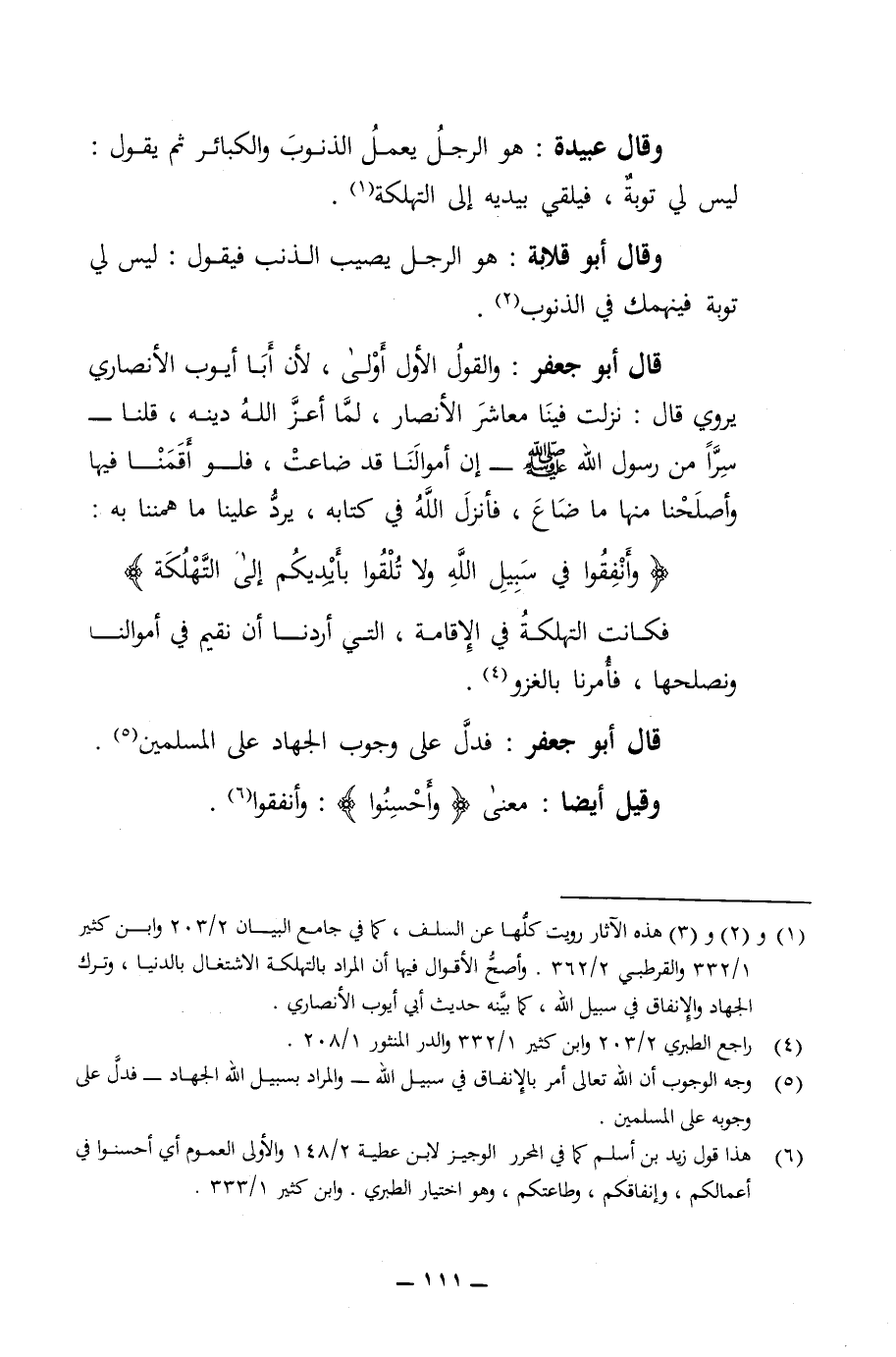 وقال عبيدة هو الرجل يعمل الذنوب والكبائر ثم يقول ليس لي توبة فيلقي بيديه الى التهلكة وقال أبو قلابة هو الرجل يصيب الذنب فيقول ليس لي توبة فينهمك في الذنوب قال أبو جعفر والقول الأول اولى لان أبا أيوب الأنصاري يروي قال نزلت فينا معاشر الأنصار لما اعز الله دينه قلنا سرا من رسول الله صلى الله عليه وسلم ان أموالنا قد ضاعت فلو أقمنا فيها وأصلحنا منها ضاع فأنزل الله في كتابه يرد علينا ماهمننا إلا به أنفقوا في سبيل الله ولا تلقوا بأيديكم الى التهلكة فكانت التهلكة في الإقامة التي أردنا أن نقيم في أموالنا ونصلحها فأمرنا بالغزو قال أبو جعفر فدل على وجوب الجهاد على المسلمين وقيل أيضا معنى وأحسنوا وأنفقوا