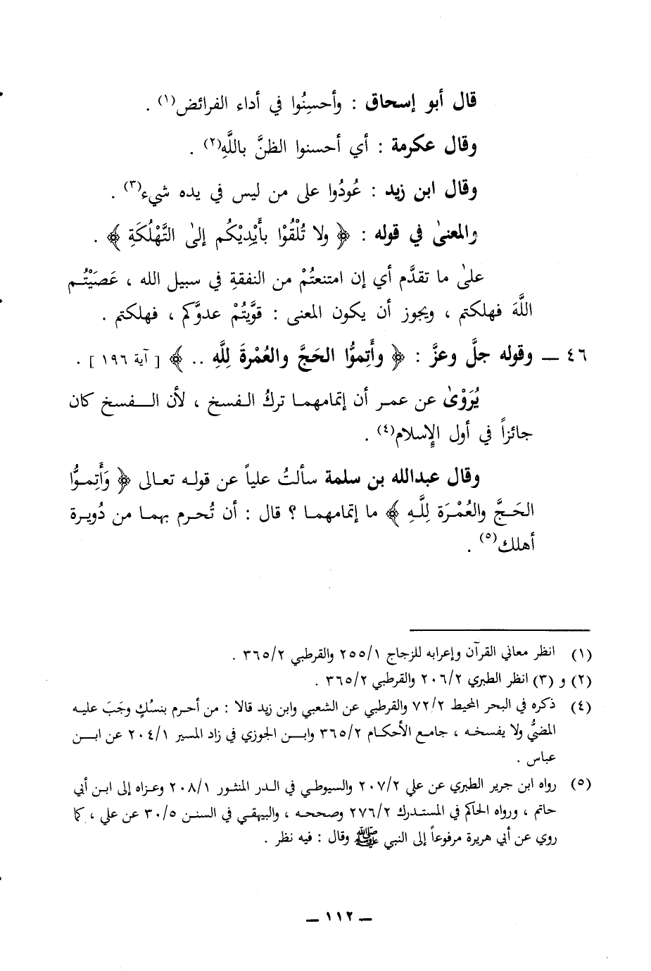 قال أبو إسحاق واحسنوا في أداء الفرائض وقال عكرمة أي احسنوا الظن بالله وقال ابن زيد عودوا على من ليس في يده شئ والمعنى في قوله ولا تلقوا بأيديكم الى التهلكة على ما تقدم أي أن امتنعتم من النفقة في سبيل الله عصيتم الله فهلكتم ويجوز أن يكون المعنى قوتم فيه عدوكم فهلكتم 46 - وقوله جل وعز وأتموا الحج والعمرة لله يروى عن عمر أن إتمامهما ترك الفسخ لان الفسخ كان جائزا في اول الإسلام وقال عبد الله بن سلمة سالت عليا عن قوله تعالى وأتموا الحج والعمرة لله ما إتمامهما قال ان تحرم بهما من دويرة أهلك