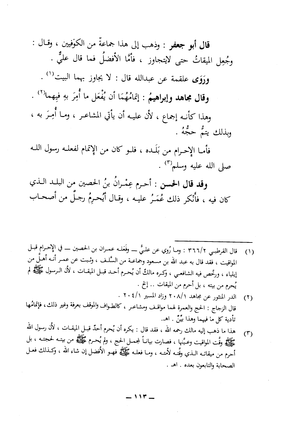 قال أبو جعفر وذهب الى هذا جماعه من الكوفيين وقال وجعل الميقات حتى لا يتجاوز فأما الأفضل فما قال علي وروى علقمة عن عبد الله قال لا يجاور بهما البيت وقال مجاهد وإبراهيم إتمامهما أن يفعل ما أمر به فيهما وهذا كأنه إجماع لان عليه أن يأتي المشاعر وما أمر به وبذلك يتم حجه فأما الإحرام من بلده فلو كان من الإتمام لفعله رسول الله صلى الله عليه وسلم