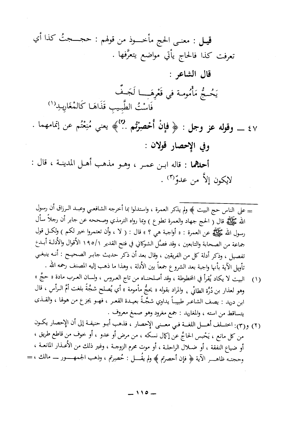 قيل معنى الحج مأخوذ من قولهم حججت كذا أي تعرفت كذا فالحاج يأتي مواضع بتعرفها صلى قال الشاعر * يحج مأمومة في قعرها لجف * فاست الطبيب قذاها كالمغاريد * 47 - وقوله جل وعز فان احصر تم يعني منعتم عن إتمامهما وفي الأحصار قولان أحدهما قاله ابن عمر وهو مذهب أهل المدينة قال