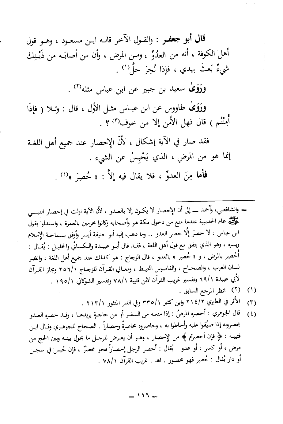 قال أبو جعفر والقول الاخر قاله ابن مسعود وهو قول أهل الكوفة انه من العدو ومن المرض وأن من أصابه من ذينك شئ بعث بهدي فإذا نحر حل وروى سعيد بن جبير عن ابن عباس مثله وروى طاووس عن ابن عباس مثل الأول وتلا فإذا آمنتم قال نهل الا من الا من خوف فقد صار في الآية أشكال لان الاحصار عند جميع أهل اللغة إنما هو من المرض الذي يحبس عن الشئ فأما من العدو فلا يقال فيه الا حصر
