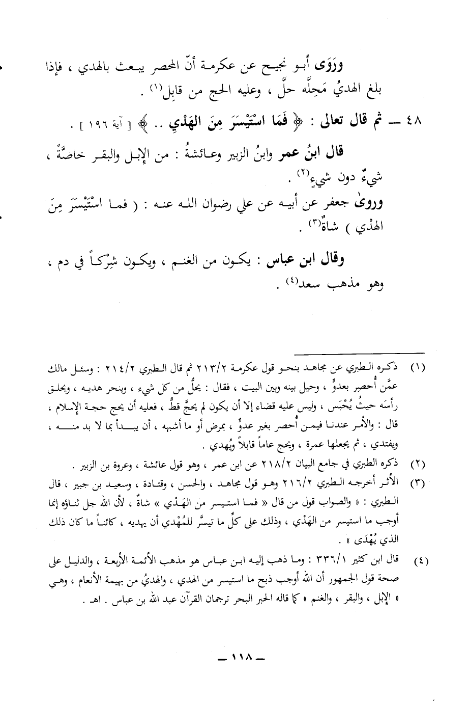 وروى أبو نجيح أنه عن عكرمة ان المحصر يبعث بالهدي فإذا بلغ الهدي محله حل وعليه الحج من قابل 48 - ثم قال تعالى فما استيسر من الهدي قال ابن عمر وابن الزبير وعائشة من الإبل والبقر خاصة شئ دون شئ وروى جعفر عن ابيه عن علي رضوان الله عنه فما استيسر من الهدي شاه وقال ابن عباس يكون من الغنم ويكون شركا في دم وهو مذهب سعد