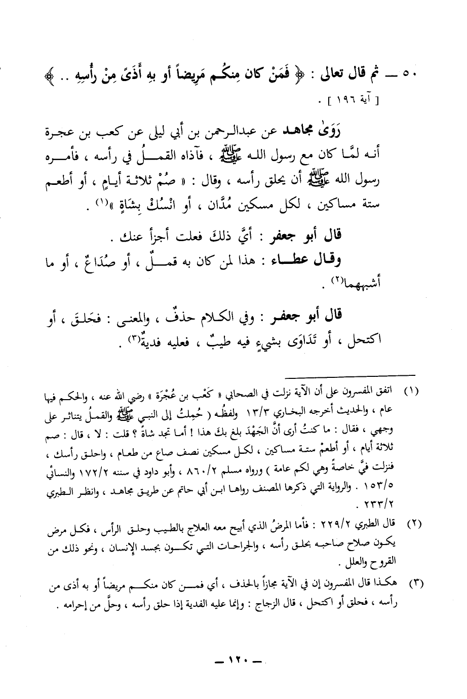 50 - ثم قال تعالى فمن كان منكم مريضا أوبه أذى من رأسه روى مجاهد عن عبد الرحمن بن ابي ليلى عن كعب بن عجره انه لما كان مع الرسول صلى الله عليه وسلم فآذاه القمل في رأسه فأمره رسول الله صلى الله عليه وسلم أن يحلق رأسه وقال صم ثلاثة أيام أو أطعم ستة مساكين لكل مسكين مدان أو انسك بشاه قال أبو جعفر أي ذلك فعلت أجزأ عنك وقال عطاء هذا لمن كان به قمل أو صداع أو ما أشبهما قال أبو جعفر وفي الكلام حذف والمعنى فحلق أو اكتحل أو تداوى بشئ فيه طيب فعليه فدية