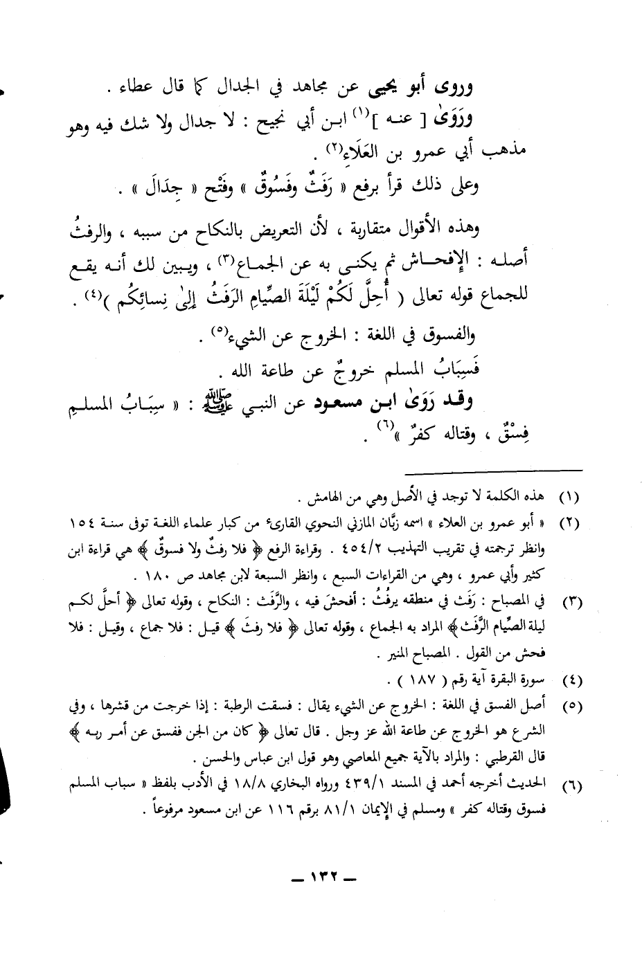 أصله الإفحاش ثم يكنى به الجماع ويبين لك انه يقع للجماع قوله تعالى أحل لكم ليلة الصيام الرفث الى نسا ئكم والفسوق في اللغة الخروج عن الشئ فسباب إذا المسلم خروج عن طاعة الله وقد روى ابن مسعود عن النبي صلى الله عليه وسلم سباب المسلم فسق وقتاله كفر