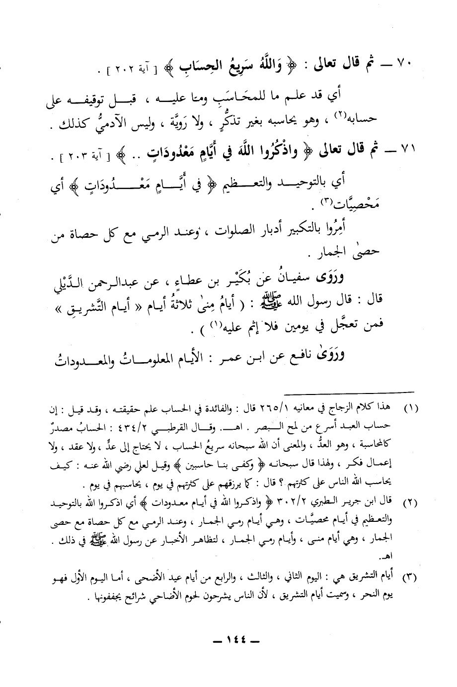 حسابه وهو يحاسبه بغير تذكر ولا روية وليس الآدمي كذلك 71 - ثم قال تعالى واذكروا الله في أيام معدودات أي بالتوحيد والتعظيم في أيام معدودات أي محصيات أمروا بالتكبير أدبار الصلوات وعند الرمي مع كل حصاة من حصى الجمار وروى سفيان عن بكير بن عطاء عن عبد الرحمن الديلي قال قال رسول الله صلى الله عليه وسلم أيام منى ثلاثة أيام أيام التشريق فمن تعجل في يومين فلا أثم عليه وروى نافع عن ابن عمر الأيام المعلومات والمعدودات