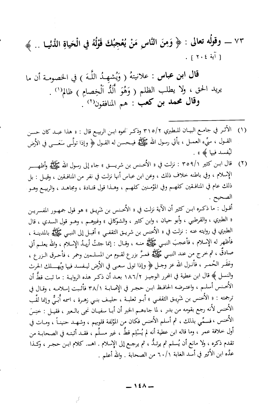 73 - وقوله تعالى ومن الناس من يعجبك قوله في الحياة الدنيا قال ابن عباس علانيته ويشهد الله في الخصومة أن ما يريد الحق ولا يطلب الظلم وهو ألد الخصام ظالم وقال محمد بن كعب هم المنافقون