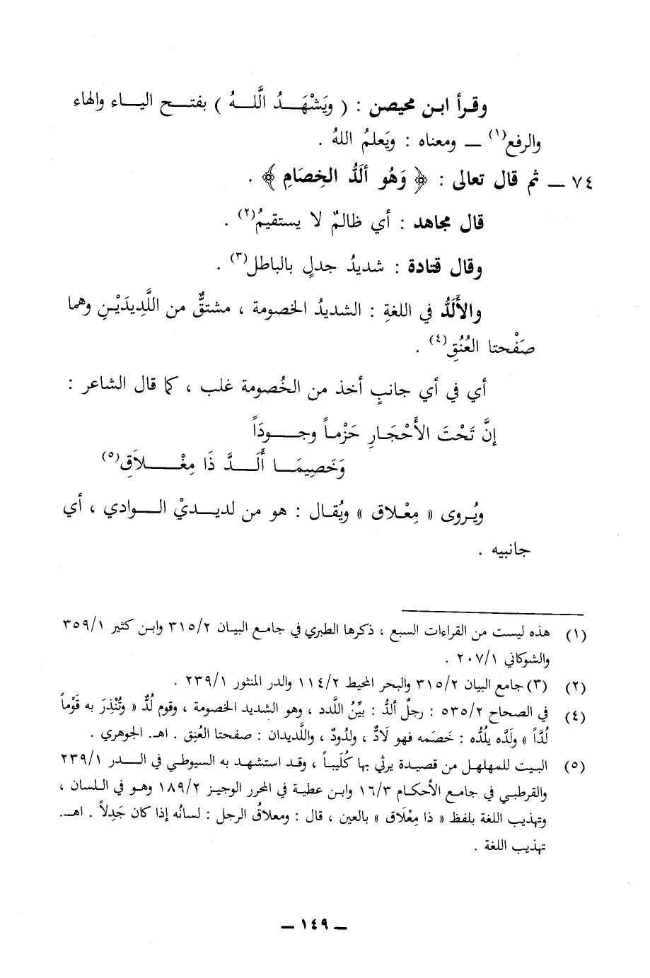 وقرأ ابن محيصن ويشهد الله بفتح الياء الهاء والرفع ومعناه يعلم الله 74 - ثم قال تعالى وهو ألد الخصام قال مجاهد أي ظالم لا يستقيم وقال قتاده شديد جدل بالباطل والألد في اللغة الشديد الخصومة مشتق من اللديدين وهما صفحتا العنق أي في أي جانب أخذ من الخصومة غلب كما قال الشاعر * أن تحت الأحجار حزما وجودا * وخصيما ألد ذا مغلاق * ويروى معلاق ويقال هو من لديدي الوادي أي جانبيه