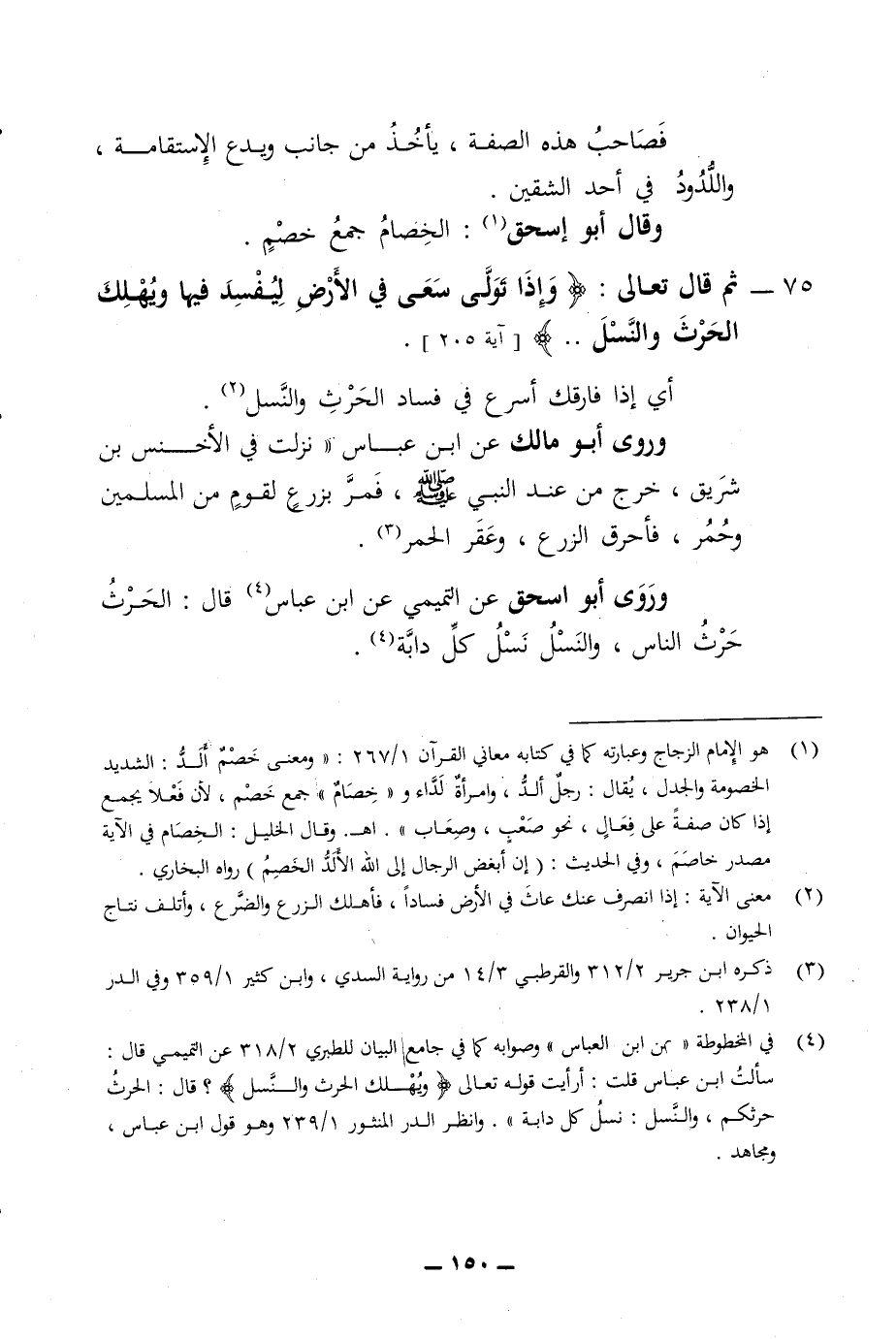 75 - ثم قال تعالى وإذا تولى سعى في الارض ليفسد فيها ويهلك الحرث والنسل أي إذا فارقك أسرع في فساد الحرث والنسل وروى أبو مالك عن ابن عباس نزلت في ألا خنس بن شريق خرج من عند النبي صلى الله عليه وسلم فمر بزرع لقوم من المسلمين وحمر فأحرق الزرع وعقر الحمر وروى أبو اسحق عن التميمي عن ابن عباس قال الحرث حرث الناس والنسل نسل كل دابة