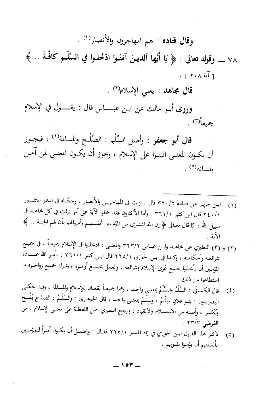 وقال قتاده هم المهاجرون والأنصار 78 - وقوله تعالى يا أيها الذين آمنوا ادخلوا في السلم كافة قال مجاهد يعني الإسلام وروى أبو مالك عن ابن عباس قال يقول في الإسلام جميعا قال أبو جعفر وأصل السلم الصلح والمسالمة فيجوز أن يكون المعنى اثبتوا على الإسلام ويجوز أن يكون المعنى لمن آمن ب لسانه